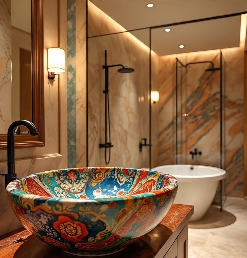 Handcrafted with earthy tones and fine glaze, the Earth Harmony Basin bridges modern design with tribal spirit. Each brushstroke tells a story — terracotta, beige, and deep sienna blending like soil and sunset. This sink belongs in spaces that celebrate roots, warmth, and authenticity. It’s tactile, grounding, and real — the opposite of sterile luxury. Here, imperfection is not a flaw but a sign of the artist’s hand and heart.