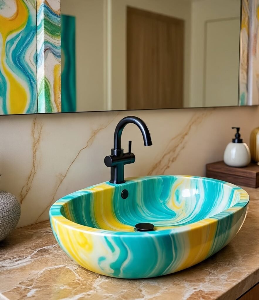 Swirls of blue and gold dance through the Celestial Wave Basin, a piece inspired by starlight over ocean tides. When light touches it, the basin seems to move — alive with quiet motion. It’s perfect for those who seek peace through design, where water becomes an echo of the universe’s flow. The blend of shimmer and tone brings sophistication without losing spirit, turning daily washing into an act of meditation.