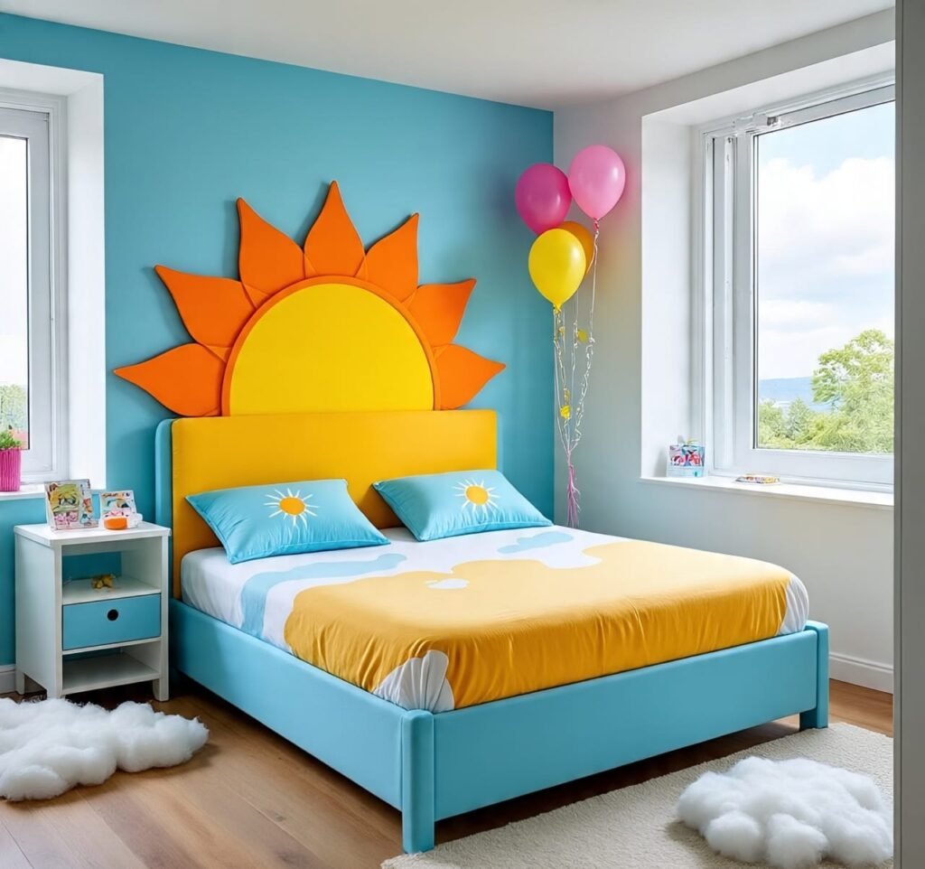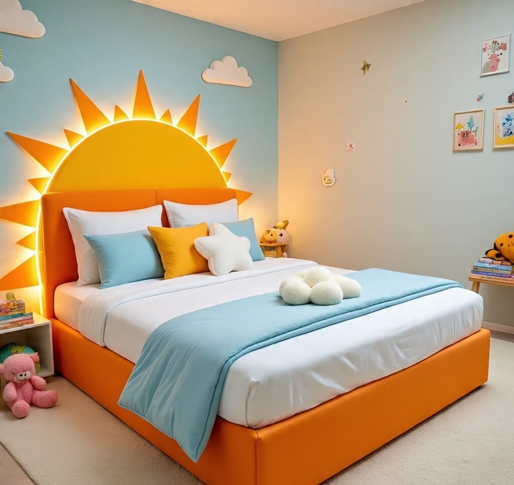 This sixth room celebrates the very edge of daylight — the moment when gold kisses silver and blue. The bed’s bright orange base anchors the cool tones above, crowned by a huge half-sun that radiates warmth into the space. It’s an artistic expression of balance and awakening. A touch of white in the walls and bedding ensures that the color story stays breathable. This isn’t just for children — adults seeking rejuvenation can find peace here too. The mix of clean lines, joyful palette, and minimal clutter turns this room into a meditative zone. The sunlight filtering through the window enhances the sunburst headboard, reminding us how interior design can honor the natural world. It’s a place for reflection, warmth, and a new beginning each morning.