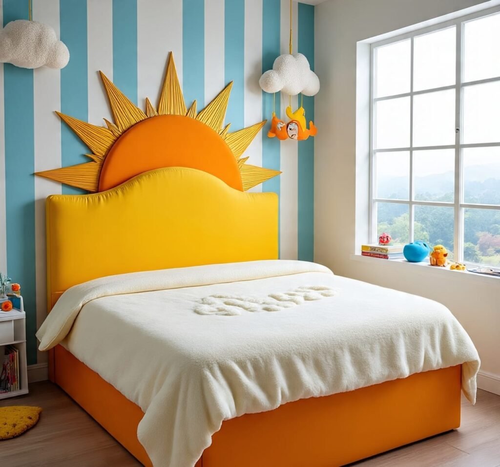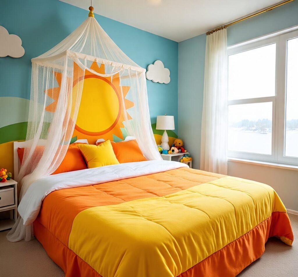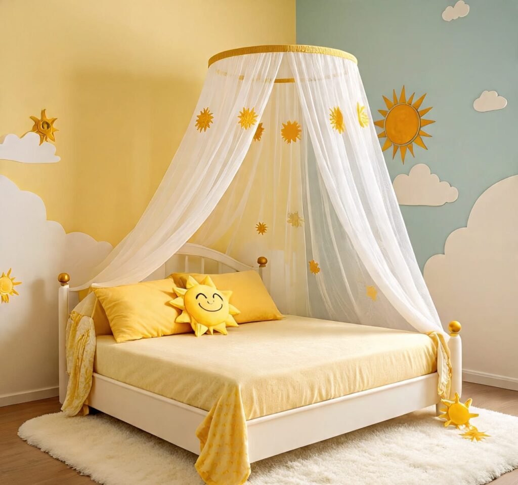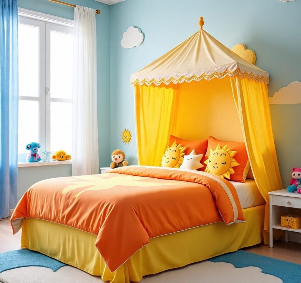 Here, the sun itself seems to rest beside the sleeper. A radiant mural glows behind the bed, while the bedding carries gentle tones of yellow and terracotta. The canopy adds elegance, softening every corner. Natural light floods through the window, amplifying every golden surface. This room embodies the spiritual harmony between light and rest — vibrant, but peaceful. It’s ideal for homes where morning energy is cherished. Designers often overlook emotional warmth, but this space masters it. Every inch whispers balance, gratitude, and renewal — a sacred trio of home comfort.