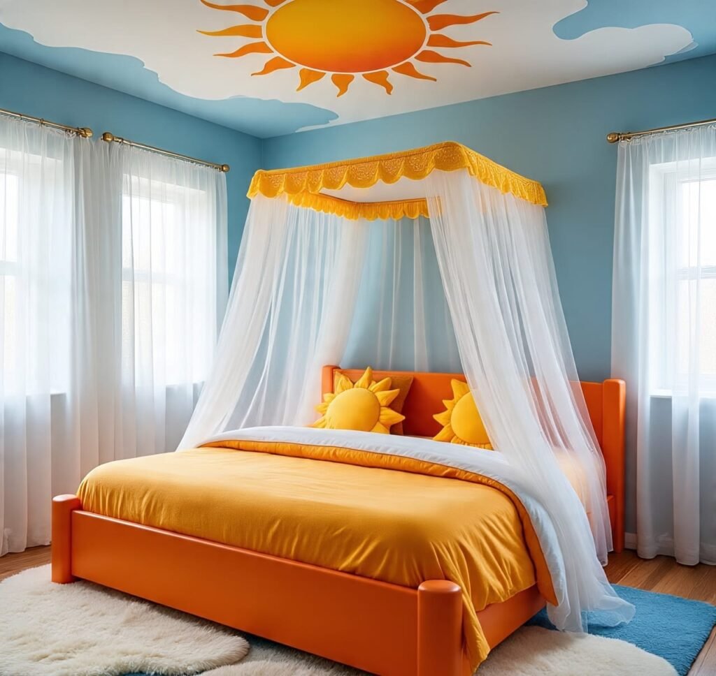 Here, luxury meets childhood wonder. The orange-gold bedding glows beneath a royal canopy that drips with white netting — soft as morning mist. Above, a painted sun peers from the ceiling, gently watching over the bed. The design embraces contrast: the warm sunset hues below meet the cool morning sky around. It feels like stepping into a fairytale built on the edge of sunrise. The canopy not only beautifies but also softens light, creating a cocoon of comfort and safety. The mix of orange and sky blue ignites energy while preserving calm — a clever interior harmony. Families could replicate this by using drapery over a bed frame, emphasizing layered texture and natural light. The room sings in golden tones, calling back the ancestral belief that dawn is the bridge between dreams and the living world.
