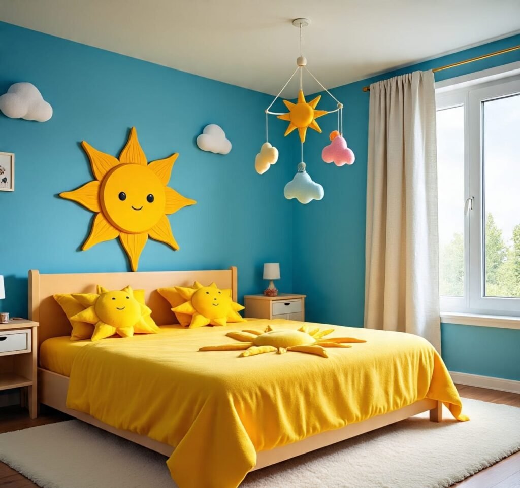 In the first room, sunlight seems to breathe through every corner. A radiant orange sun rises above a pale blue wall, smiling down upon a sky-colored bed draped with soft golden sheets. The warmth feels alive, almost sacred, like the first song of dawn in the plains. Cotton clouds hug the windows, giving the space a dreamy innocence that reminds one of childhood mornings. This design tells a story of balance — cool skies meeting warm horizons. The combination of yellow and sky blue makes the room not only cheerful but balanced in temperature and emotion. It’s a perfect setup for families wishing to wake up to optimism. The color palette boosts serotonin, making mornings easier and evenings softer. Adding light wood floors and cloud-shaped rugs completes the natural, gentle energy. A child’s laughter or a peaceful nap could easily fill this space. It’s more than décor — it’s a celebration of the rising sun, a new day reborn inside four bright walls.