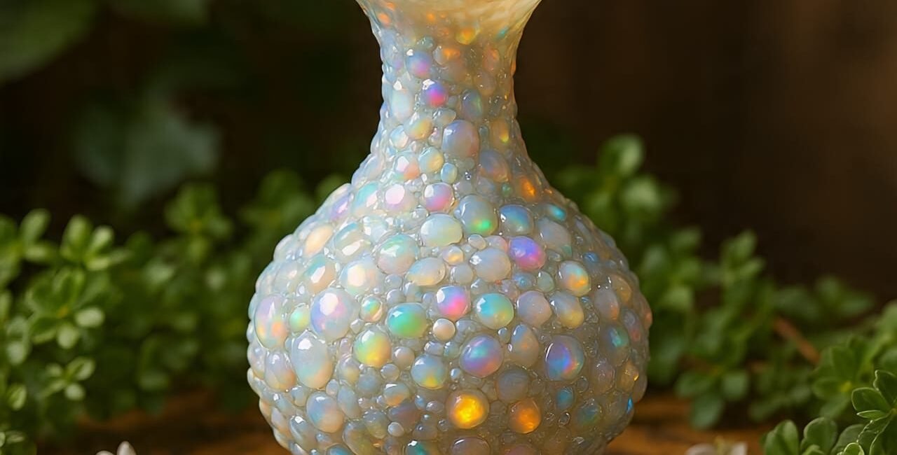 A Circle of Light in Every Stone. This vase not only blooms – it contains stories. Each pearl, built into the surface, seems like a sun dance...
