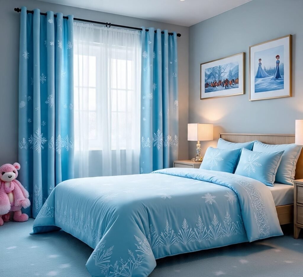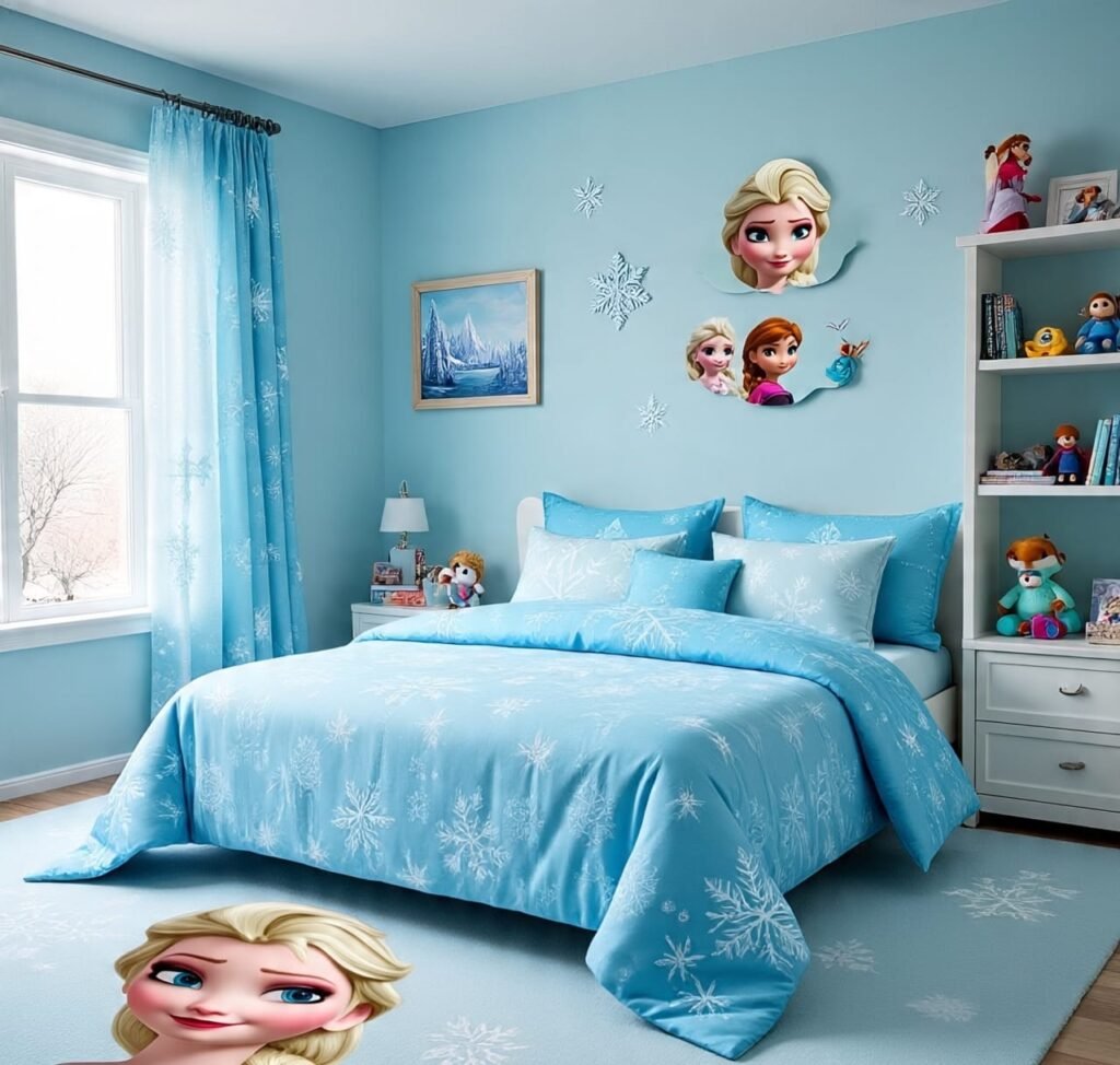 There is something timeless about the color blue, especially when it dresses a bedroom in shades of ice, sky, and sea. Blue whispers of calmness, renewal, and clarity, making it one of the most powerful hues for rest and balance. When paired with themed décor, such as snowflakes, characters, and soft white accents, a blue bedroom becomes more than just a place to sleep—it transforms into a sanctuary of dreams. The following designs, inspired by winter’s stillness and playful wonder, reveal how décor and color can work together to craft spaces filled with peace, joy, and imagination.