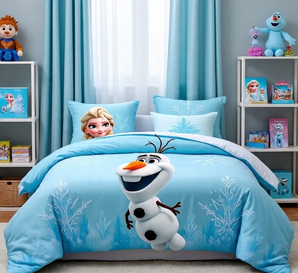 Playful and warm, this room captures the heart with its bright blue tones and beloved character décor. Olaf, the friendly snowman, sits proudly across the bedspread, reminding children of laughter and companionship. The sky-blue walls are softened with sheer curtains, allowing natural light to wash the room in a gentle glow. This design is cheerful, fun, and ideal for children who want their space to feel like both a sanctuary and a playground.