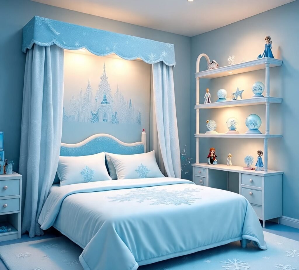 In this bedroom, décor meets functionality. A glowing white shelf is built directly into the wall above the bed, illuminating icy blue bedding with soft light. Snowflake motifs add magic, while storage space allows for both display and organization. The combination of glowing accents and frosty hues makes the room not only stylish but also practical. This design is proof that a bedroom can be both enchanting and functional.
