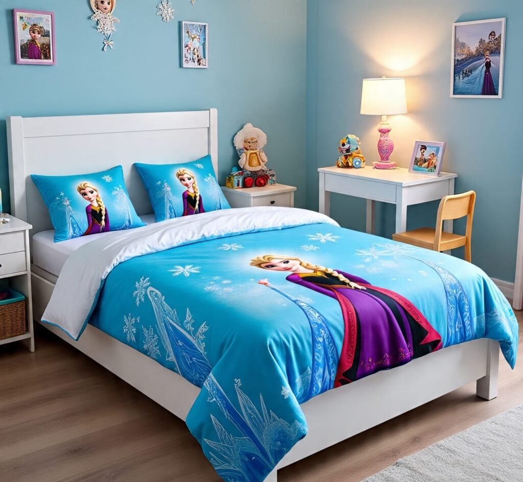 The final bedroom blends frozen fantasy with a touch of the sea. Here, bold bedding with playful snow-inspired prints is paired with a deep ocean-blue rug, merging land, water, and winter skies into one. The room feels energetic yet balanced, making it a perfect fit for children who thrive on creativity. With its layers of textures, colors, and patterns, this design offers a truly dynamic interpretation of blue-themed décor.