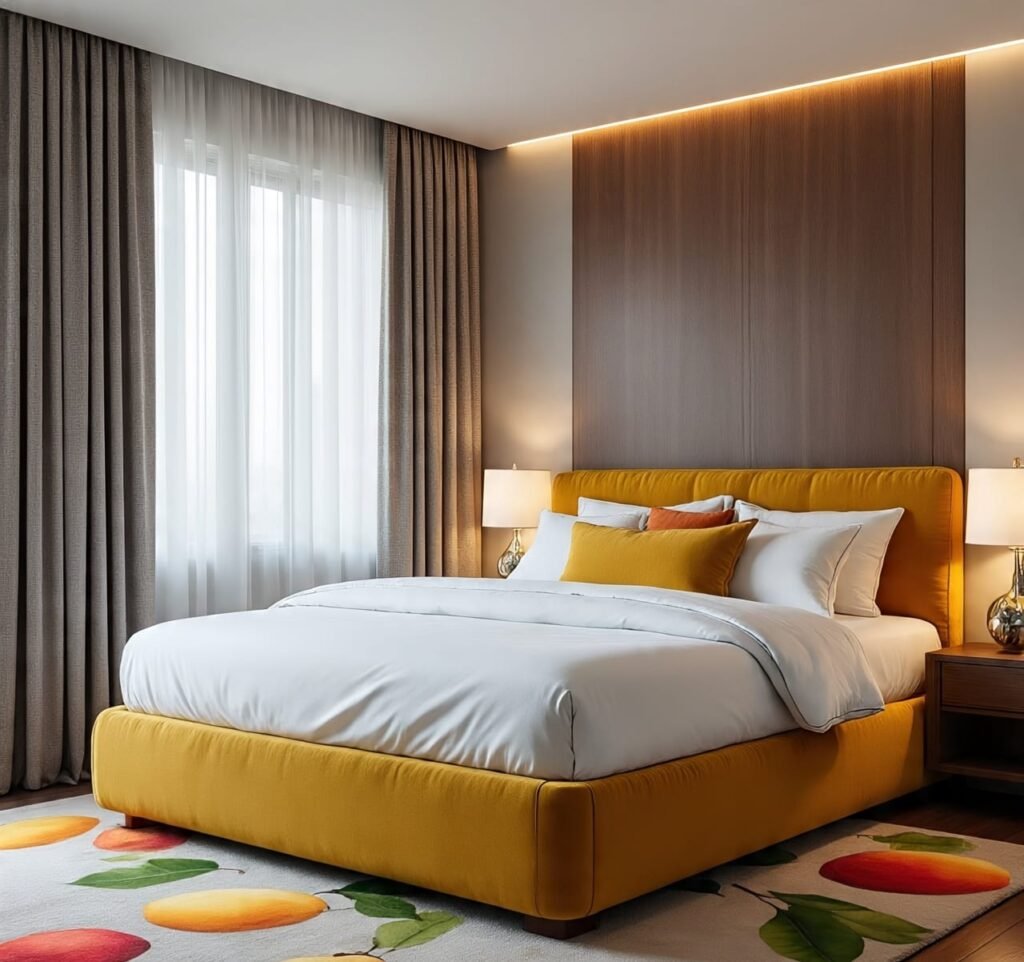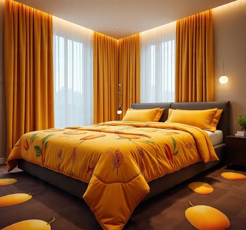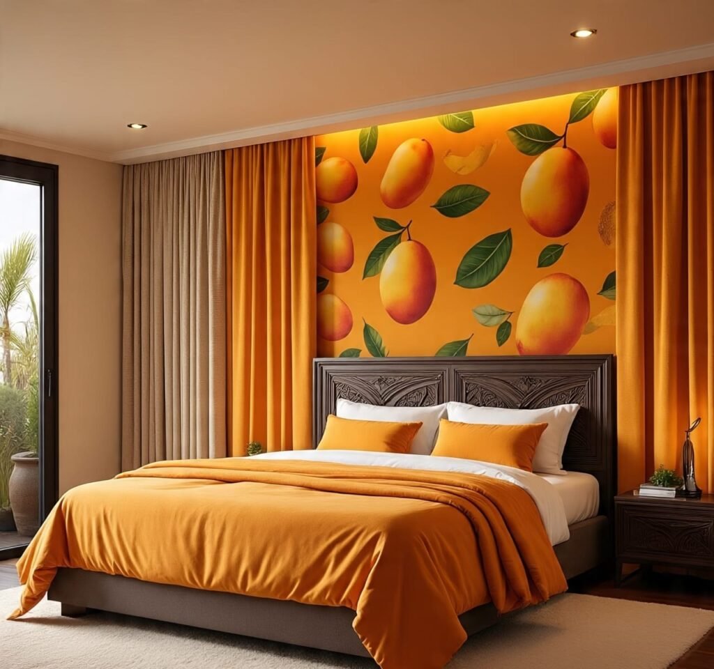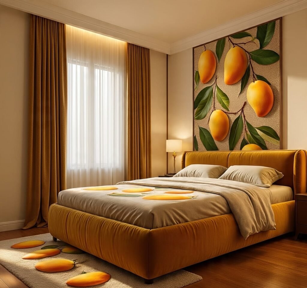 The curtains catch the light with a soft mango hue, glowing like afternoon sun sliding through orchard branches. Native-style design teachings remind us that warm colors carry life, strength, and renewal, and this room reflects that through every fabric fold and every gentle shade. The rug beneath the bed adds an extra layer of harmony with its mango-colored shapes that echo the fruit’s juicy, rounded form.
