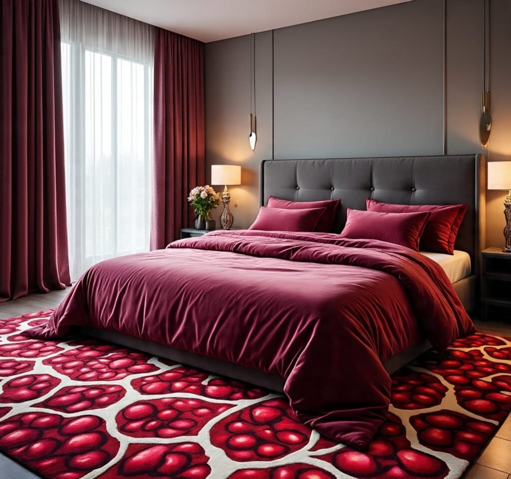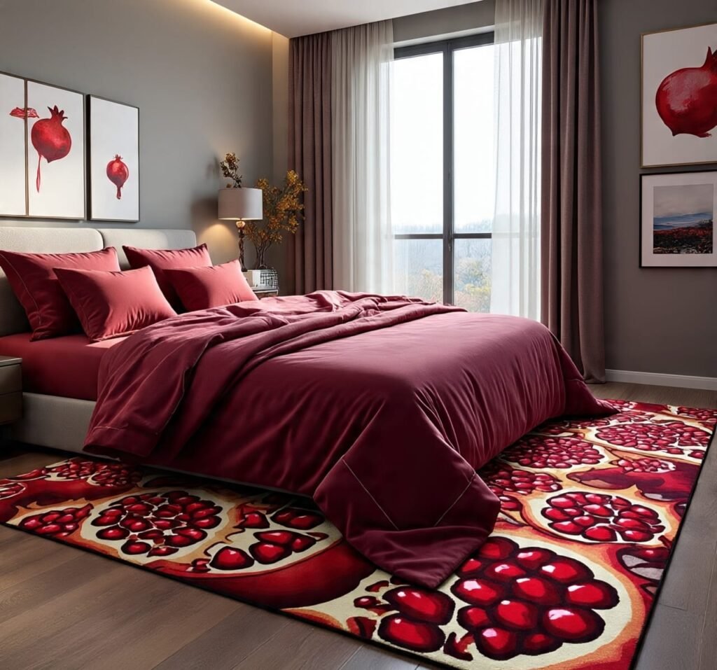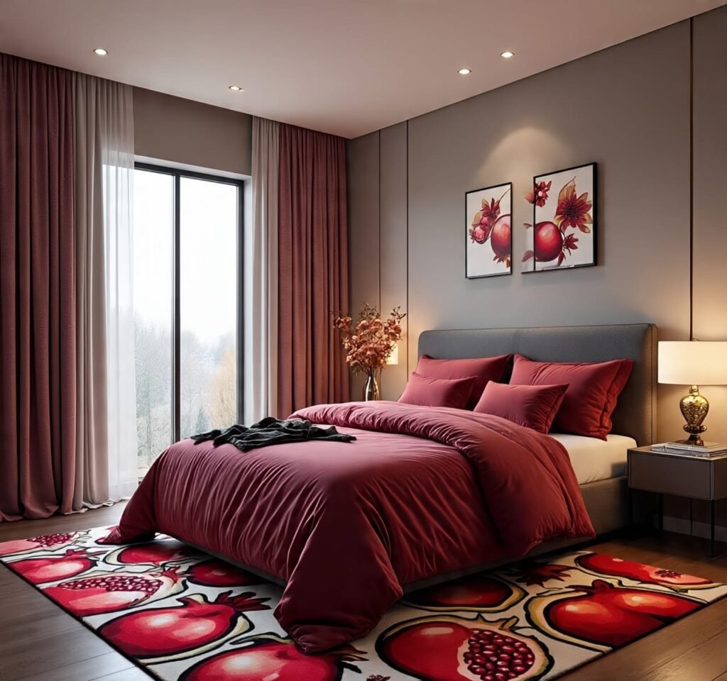The third room burns quietly like a lodge warmed by pomegranate and firelight. Deep pomegranate tones wrap the bedding, matched by earthy browns and soft beige walls. It feels like a place where the heart beats steadily, where warmth holds every limb like a woven blanket. The pomegranate-colored rug beneath the bed carries circular patterns that echo tribal paintings, drawing energy toward the center of the room. Subtle wall art adds softness, while warm lighting completes the sanctuary. This pomegranate-inspired space offers grounding, passion, and comfort—perfect for those who carry a creative fire inside.