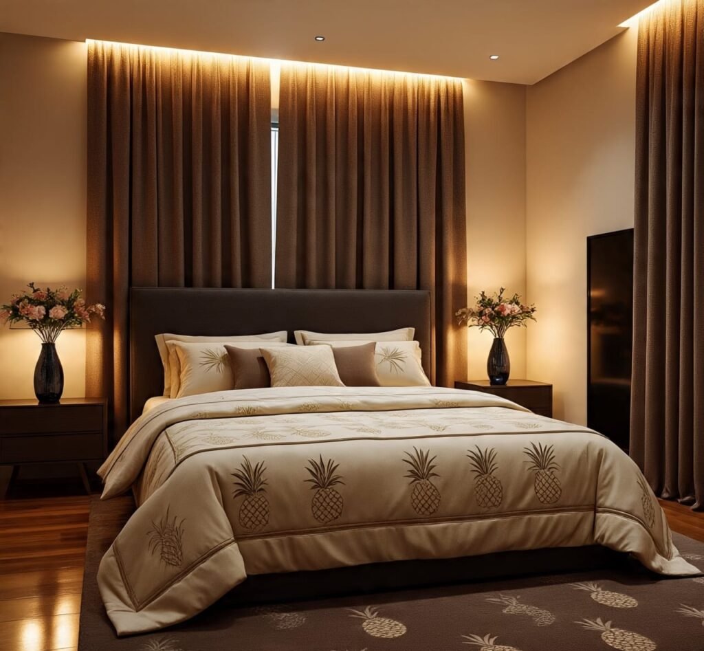 The eighth bedroom carries the brightness of sun-kissed pineapple fields. Soft white bedding adorned with pineapple motifs rests beneath golden curtains, creating a blend of warmth and purity. This chamber feels like a summer morning when the earth smells sweet and the wind moves gently through open spaces. The tribal tone comes through in the textures: woven blankets, earth-tone pillows, and natural wood furniture. It becomes a place where tropical energy meets grounded tradition, offering a haven of freshness, spirit, and calm.