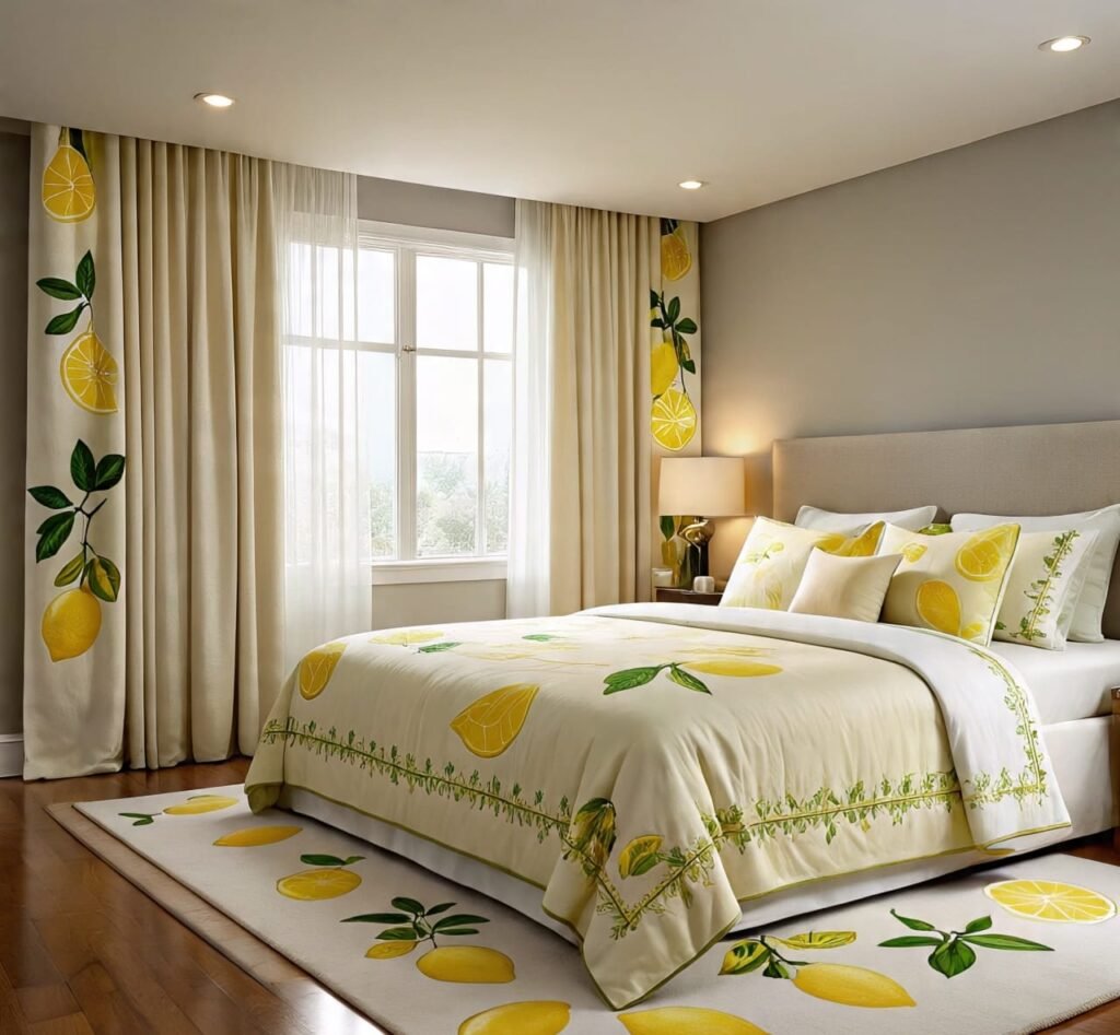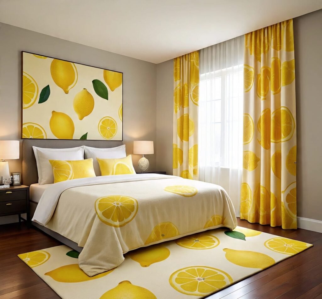 Bright, playful lemon patterns sweep across the bedding and rug. This room carries a fresh, citrus joy, brought to life by soft yellow tones and sunlit curtains inspired by lemon slices. It radiates lighthearted energy, creating a space that feels clean, cheerful, and naturally uplifting.