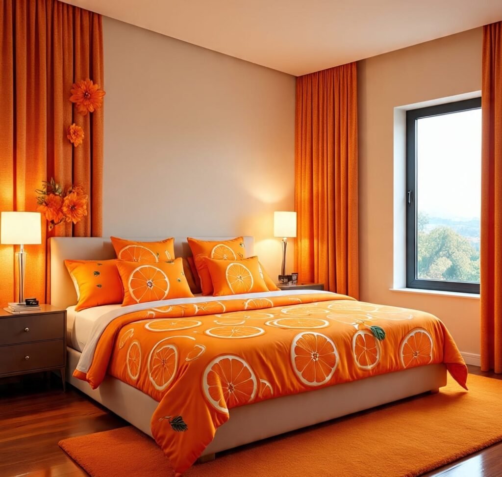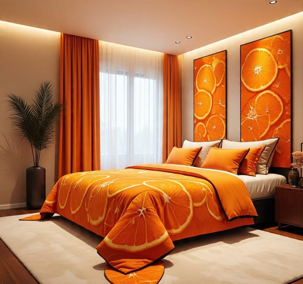 The last room combines orange, gold, and beige, creating an atmosphere like sunset rolling over orchards. The bedding carries citrus patterns that soothe and energize at once.