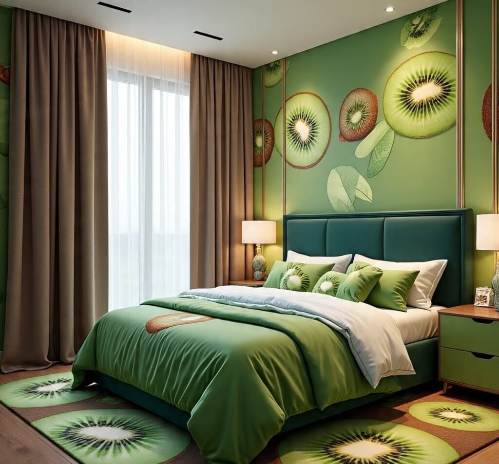 Here in the second chamber, kiwi spirits swirl like emerald medicine wheels across the walls. The room blends deep greens, earthy whites, and natural textures, forming a sacred circle of refreshment. The kiwi design on the bedding feels playful yet wise, reminding one of forests thick with dew and fresh life. This bedroom has the energy of renewal—its tones echo riverbanks and mossy stones, places where healing happens in silence. The soft light falling across the green curtains adds a calming glow, making this room a perfect space for rest, reflection, and grounding. The rug beneath ties the vision together, patterned like the inside of a sliced fruit, layered with nature’s geometry.
