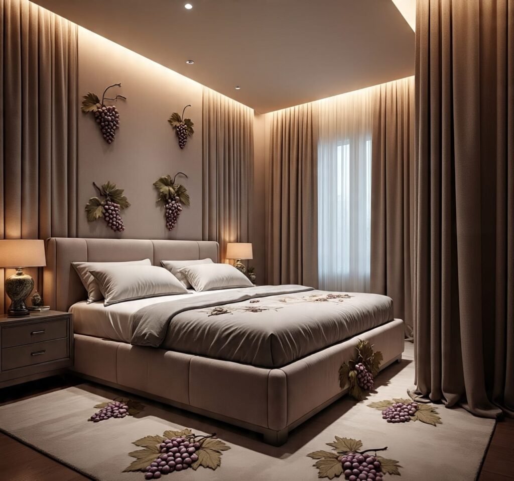 Room 24 welcomes you with the gentle spirit of grapes—symbols of abundance, harmony, and shared blessings in many ancient traditions. The bedding carries delicate grape motifs in calming purples and muted violets, each design curving like small clusters resting on a peaceful vine. These soft grape tones blend beautifully with the warm gray surroundings, creating a sanctuary that feels both modern and deeply comforting. The lighting is warm and quiet, slipping across the room like evening sun sliding through vineyard leaves.