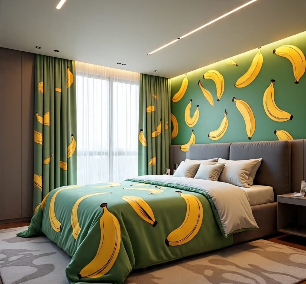 Here the banana theme returns, but in richer detail—full murals, patterned rugs, layered bedding. The room feels like a celebration of abundance. The yellow tones brighten the spirit while earthy browns keep the energy grounded.