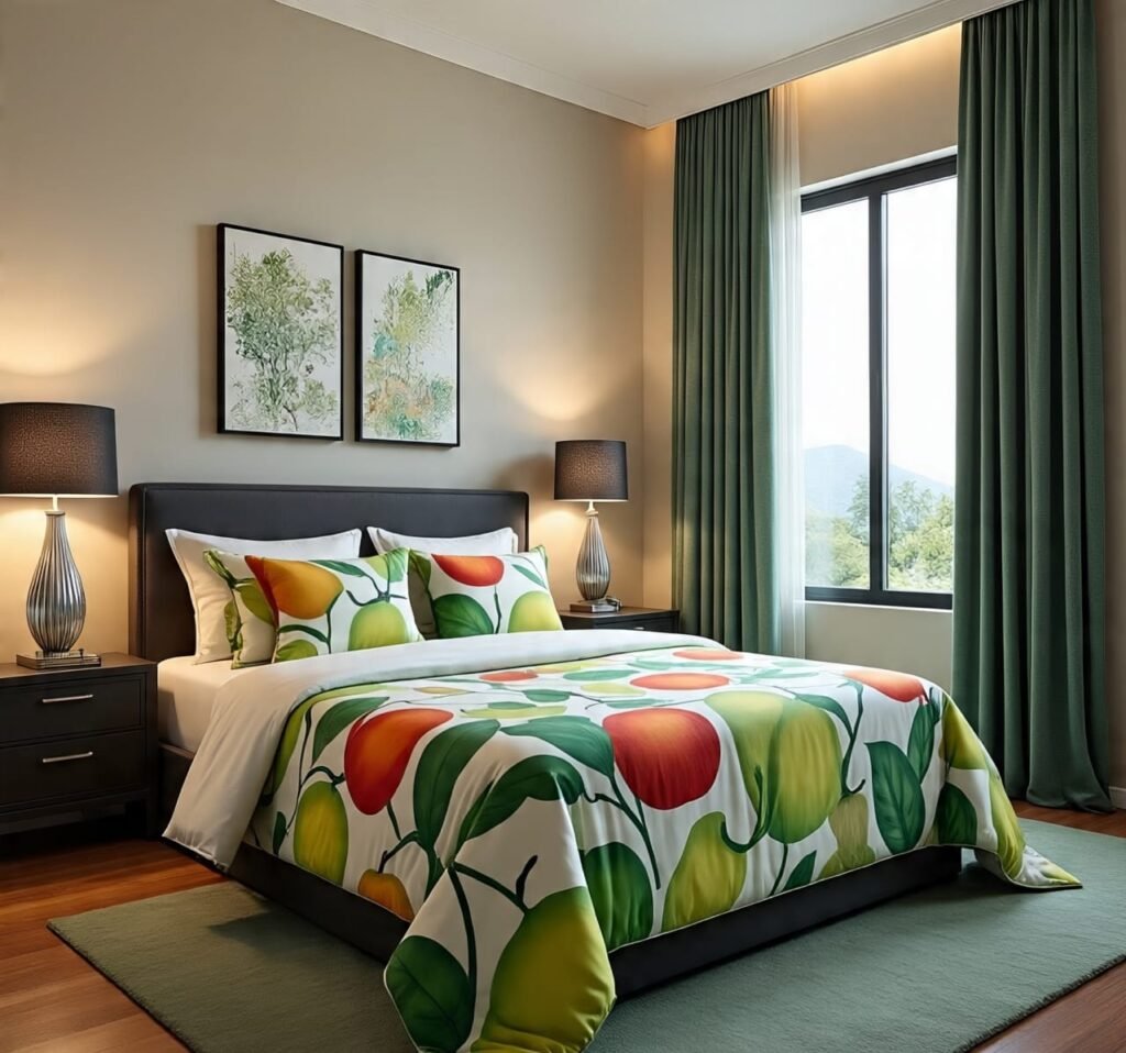 Room 23 brings the gentle sweetness of figs into a soothing, modern bedroom that feels both warm and inviting. The bedding is decorated with clear fig patterns—round, ripe motifs in soft purples, warm reds, and subtle greens that mirror the natural colors of a freshly opened fig. These designs rest beautifully against the calm beige walls, creating a peaceful balance between fruit-inspired creativity and modern elegance. The room carries a quiet harmony, the kind you feel when standing underneath a fig tree at dusk, where the air is mild and everything slows down.
