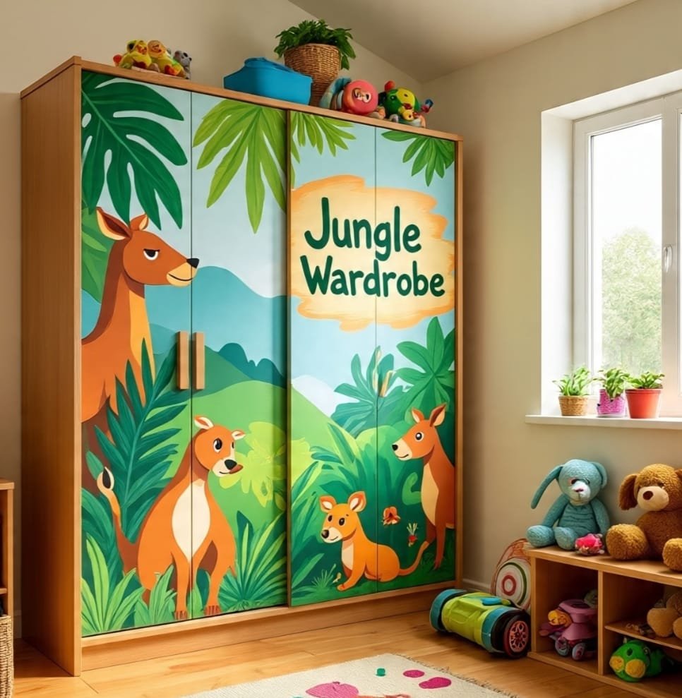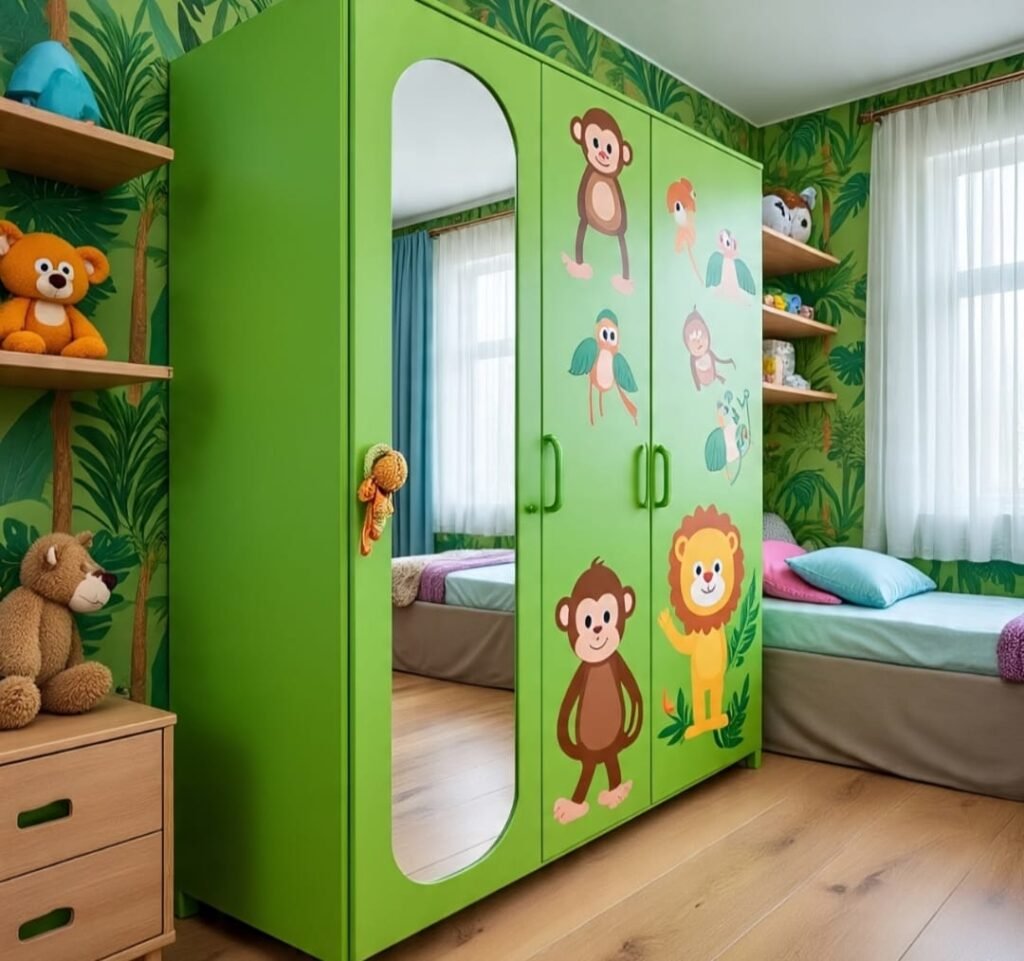 Here, wonder begins not at the window, but at the wardrobe itself. Jungle animals greet the eye before one even steps inside. A tall mirror rises beside them, reflecting green walls so the child sees themselves surrounded by nature—not just physically, but spiritually. This is a portal room, where even the door becomes a gate to imagination. The leafy colors rise from floor to ceiling, lifting the spirit as if climbing a tree. Small details—perhaps a mask, or painted blocks—add texture like carvings adorning a tribal temple. In this place, simple routines like choosing clothes becomes ritual, a small daily ceremony of identity and expression. The room reminds the child that adventure lives not only outside—but inside themselves. The brighter the imagination, the wilder the jungle becomes.