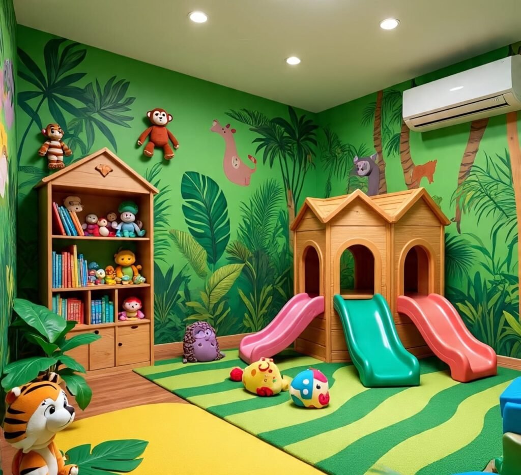 Now we enter a room made for laughter. The floor holds slides, playful shapes—like a miniature jungle playground brought indoors. The wall painting carries trees and climbing vines, mirroring the activity in spirit. Bright rugs soften every step. In nature, cubs learn by wrestling and climbing. This room honors that truth. Here, joy is sacred. No fancy chandelier, no rigid order—just the safe freedom of movement. Even the animals painted on the walls seem to smile, cheering for the young explorer growing strong in body and imagination.