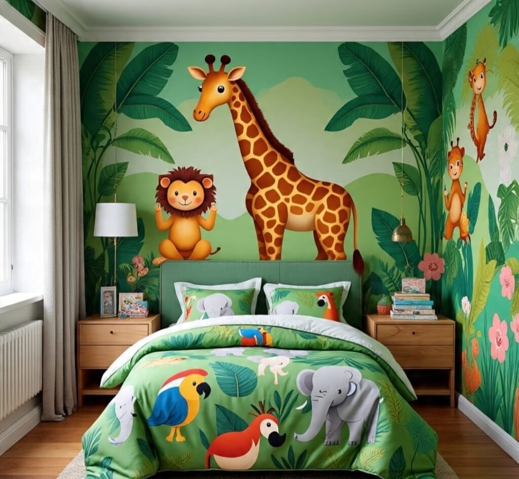 A painted forest surrounds three walls, nearly life-size. The bed rests low beside a small nightstand, as if set beside a jungle path. Even the curtains play along, matching the deep green atmosphere. This room feels like stepping into the wild rather than looking at it from afar. For a child, that is powerful. It teaches immersion. Courage. Awareness. No loud distractions—just harmony between art, wood, and dream. At night, the animals become guardians. In the morning, they become teachers. A room like this molds a respectful explorer.
