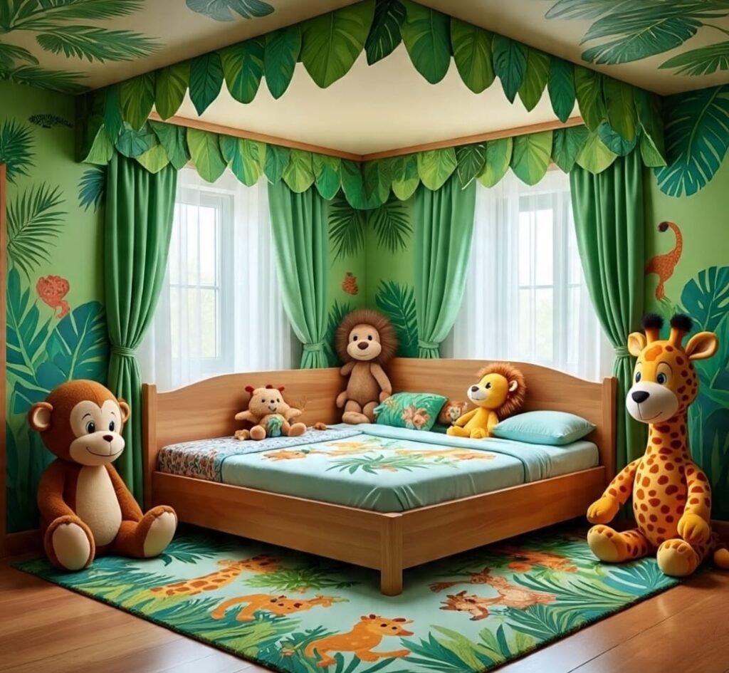 This room holds a softer palette—warm cream, gentle vines, and blossoms. The bed sits under a wooden frame like an indoor tent. Painted animals peek from leaves on the walls. This is not a loud jungle—it’s a whispered one. Perfect for a thoughtful, dreamy child. Pillows with leaf prints rest like soft stones near a river. The furniture blends seamlessly, allowing imagination to do most of the decorating. This room respects the gentle dreamers—those who see animals as friends, not challenges. Here, fantasy grows slowly, like moss on old stone.