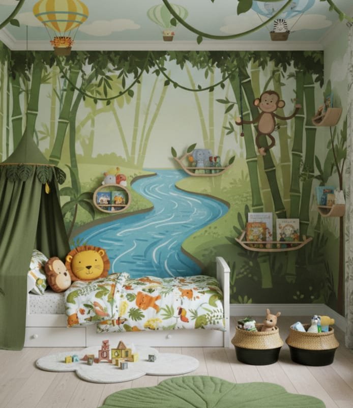 Our final room stands strong like a lodge built from trees and laughter. The bed sits inside a wooden frame shaped like a tiny house, painted with murals of bright leaves and friendly animals. The room feels ceremonial—like the child is given their own small world to protect. The walls glow with bright jungle life. A soft rug lies like forest ground under their feet. Here, storytelling becomes sacred play. Every night, the young dreamer closes their eyes inside their private jungle hut. Every morning they awaken to the lesson that imagination is a home we build, not something we find.