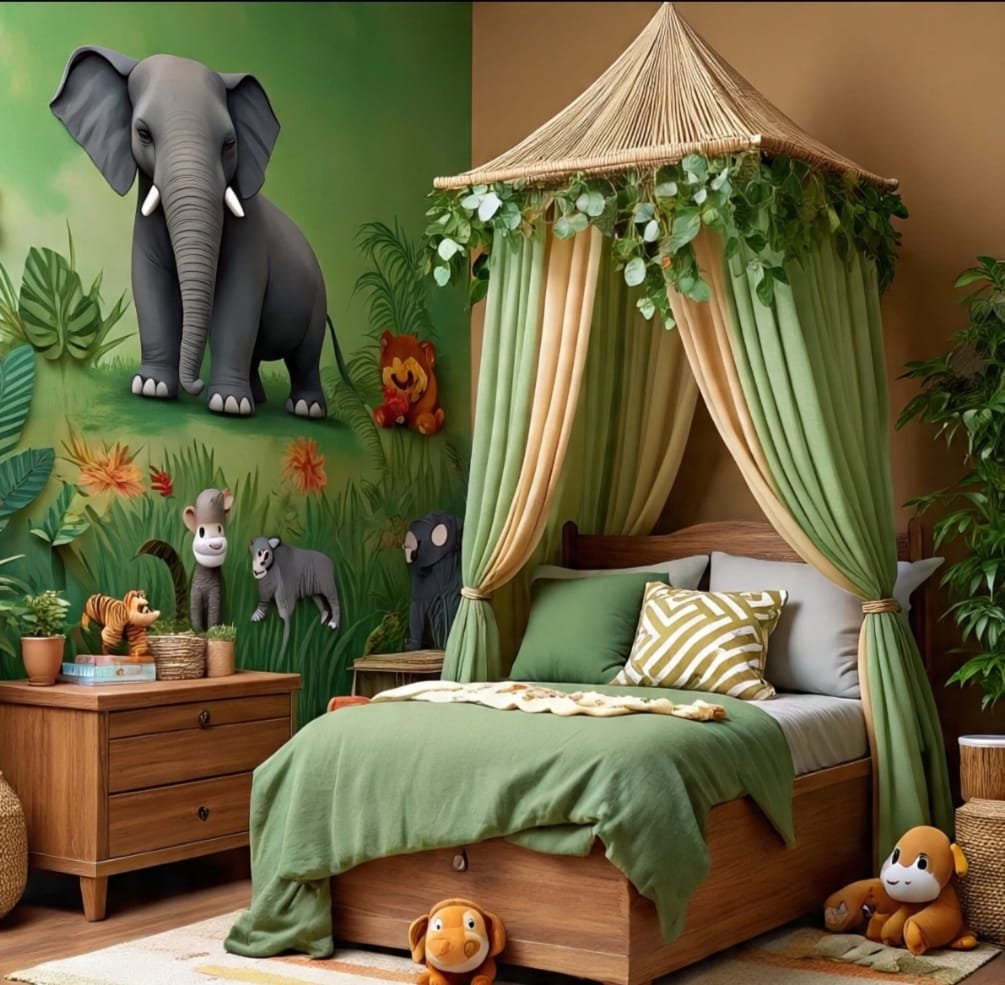 Now we arrive at a room shaped like a small clearing where an elephant sleeps under moonlight. A dreamlike shade canopy falls over the bed, soft and creamy like clouds. Painted jungle greenery surrounds the sleeping spot, while the mighty elephant stands in calm posture, neither threatening nor comical—just sacred presence. In many tribes, elephant spirit teaches memory, dignity, quiet power. This room carries that energy. There are woven carpets and rattan baskets placed like offerings around a story circle. The warm wood tone of the floor settles the spirit, making the whole room feel like an outdoor shelter on a peaceful night. A child growing here will learn gentleness without weakness, and strength without noise. This is not merely décor—it is a teaching ground wrapped in canvas and paint.