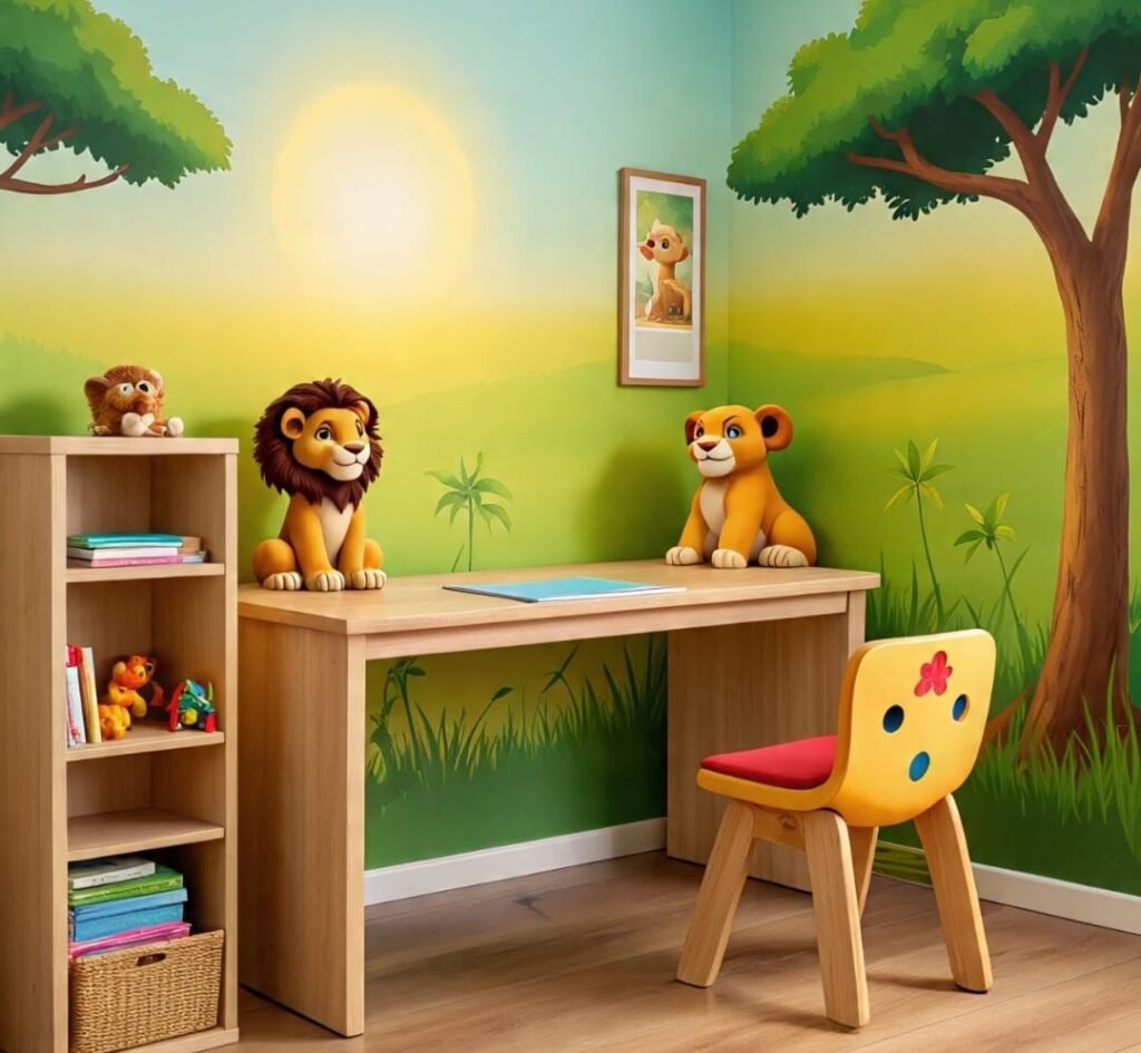Sunshine spills inside this room like liquid gold. The walls show an open field, trees standing peacefully under painted sky. A wooden desk and shelf hold meaningful objects—books, wooden toys, stuffed animals like friendly animal teachers. It feels like a safe meadow in the middle of a deep forest—open, cheerful, but still part of the great wild. There is balance between indoor comfort and outdoor energy. A child may sit at that desk drawing lions, while outside a real bird sings. This room keeps both worlds close together, as elders once taught: never forget the land, even when inside walls. The colors here heal the heart—soft yellows, calm greens, browns like fertile soil. A room like this can grow both imagination and responsibility, for no warrior ever forgets where their roots begin.