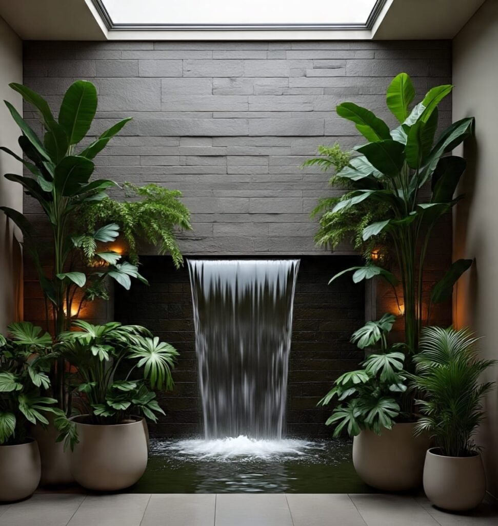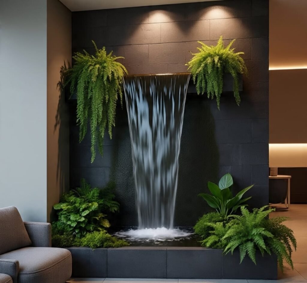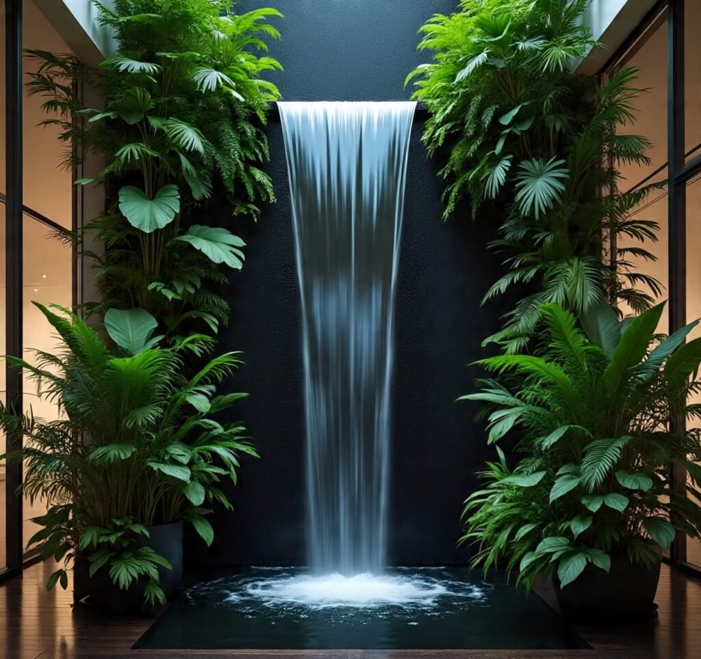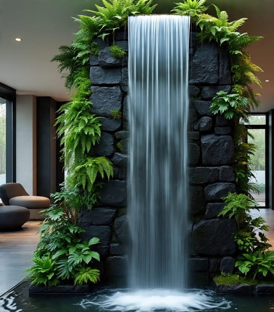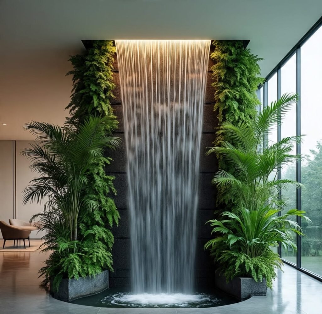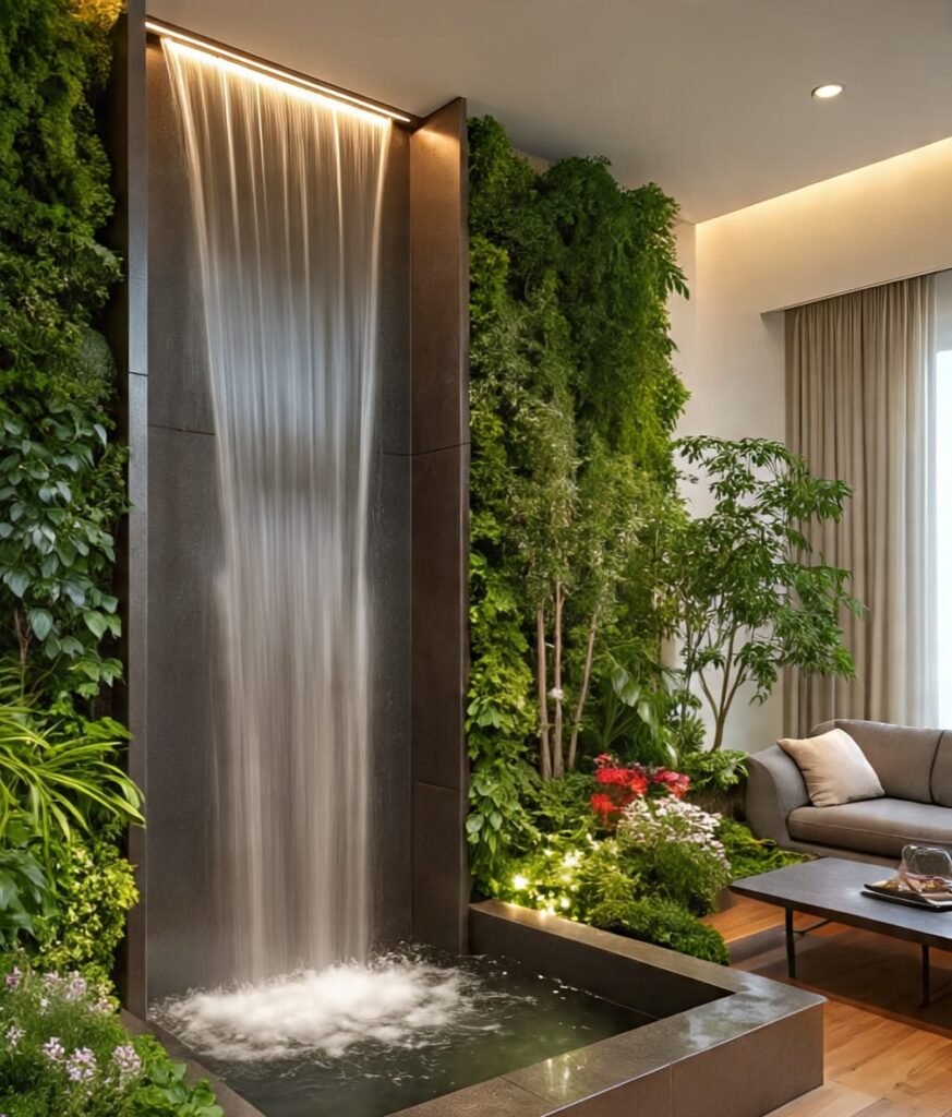 This waterfall merges beautifully with its vertical garden. Water glides through greenery, creating a living wall of motion. The combination of plant life, clean water, and smooth surfaces generates harmony between design and nature. It’s the perfect eco-luxury element for homes that value balance, life, and organic elegance.