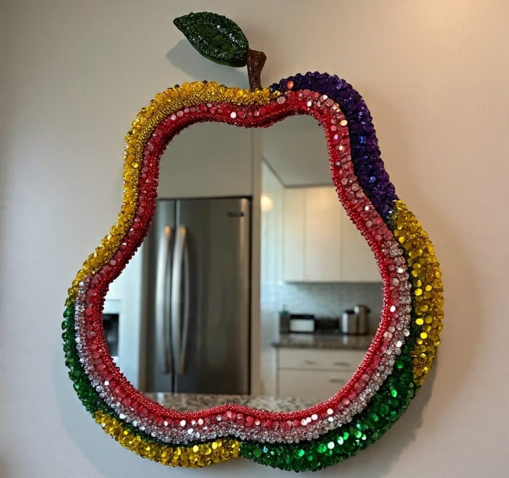 This pear-shaped mosaic mirror glows like the first light of dawn over the valley. Golden and crimson tiles frame its curves, whispering of harvest seasons and full baskets. In Native storytelling, the pear is a symbol of generosity—sharing sweetness with all. Hanging this mirror in your kitchen or dining room invites that same spirit into your home. Every reflection is wrapped in color, turning the ordinary into something worth cherishing. It’s more than decoration—it’s a daily blessing.