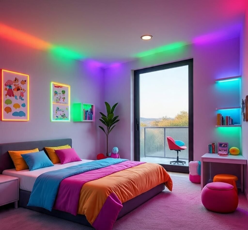 In the first room, the glow of shifting colors feels like the first glimmer of daylight breaking across an open plain. Soft purples, greens, and ambers brush the walls with a warmth that calls to the spirit, reminding us that every sunrise carries new promise. The bed, wrapped in rich earth-toned blankets accented with brighter hues, sits like a quiet resting place in the center—simple, balanced, and welcoming. The window pulls in the last kiss of daylight from outside, almost blending with the glowing lights inside, creating harmony between the natural and the crafted world. A lone plant stands nearby, its roots resting but its leaves rising like a small offering to the room’s layered colors. Posters and frames hang in gentle rhythms, echoing stories, memories, and creative sparks. The floor softens the steps with a warm rug, and small seating pieces invite a moment of rest. Everything here feels thoughtfully laid, the way a good storyteller arranges words—each in its place, each carrying meaning. The room is youthful, but carries an ancient familiarity, where great color meets quiet comfort. It is a space built for new beginnings, for slow mornings, and for minds that find peace wrapped in color and quiet structure. When you enter, you feel welcomed by both the glow and the stillness, as if the room itself whispers that rest is sacred, and waking is a gentle journey.