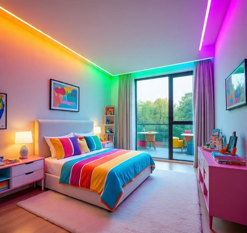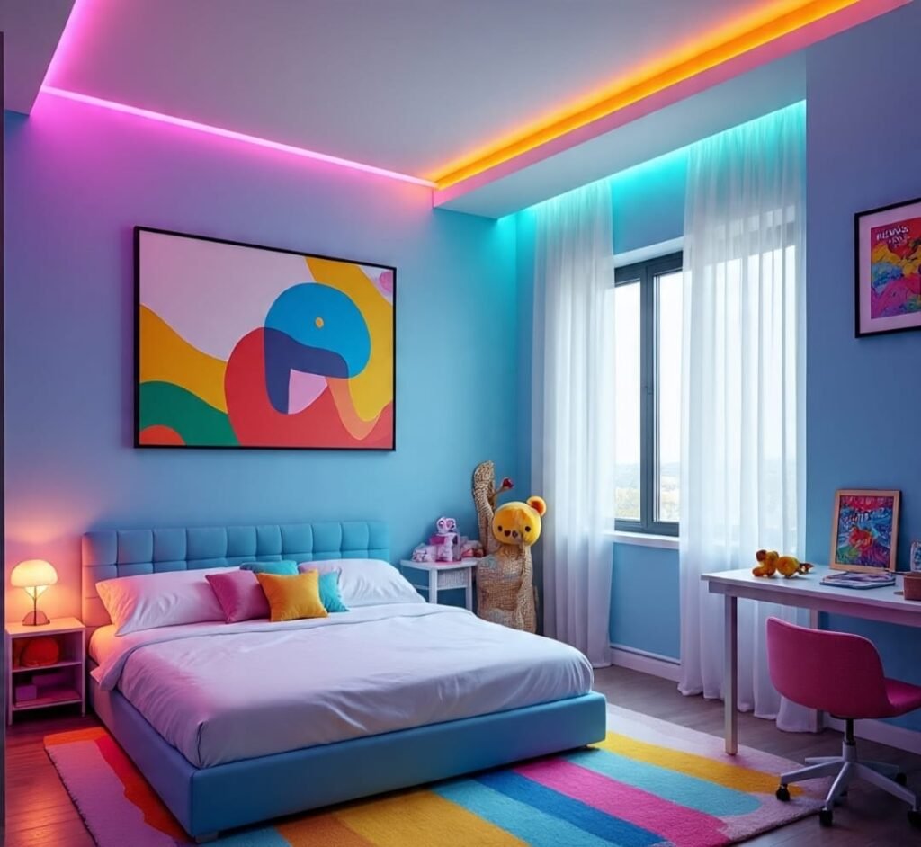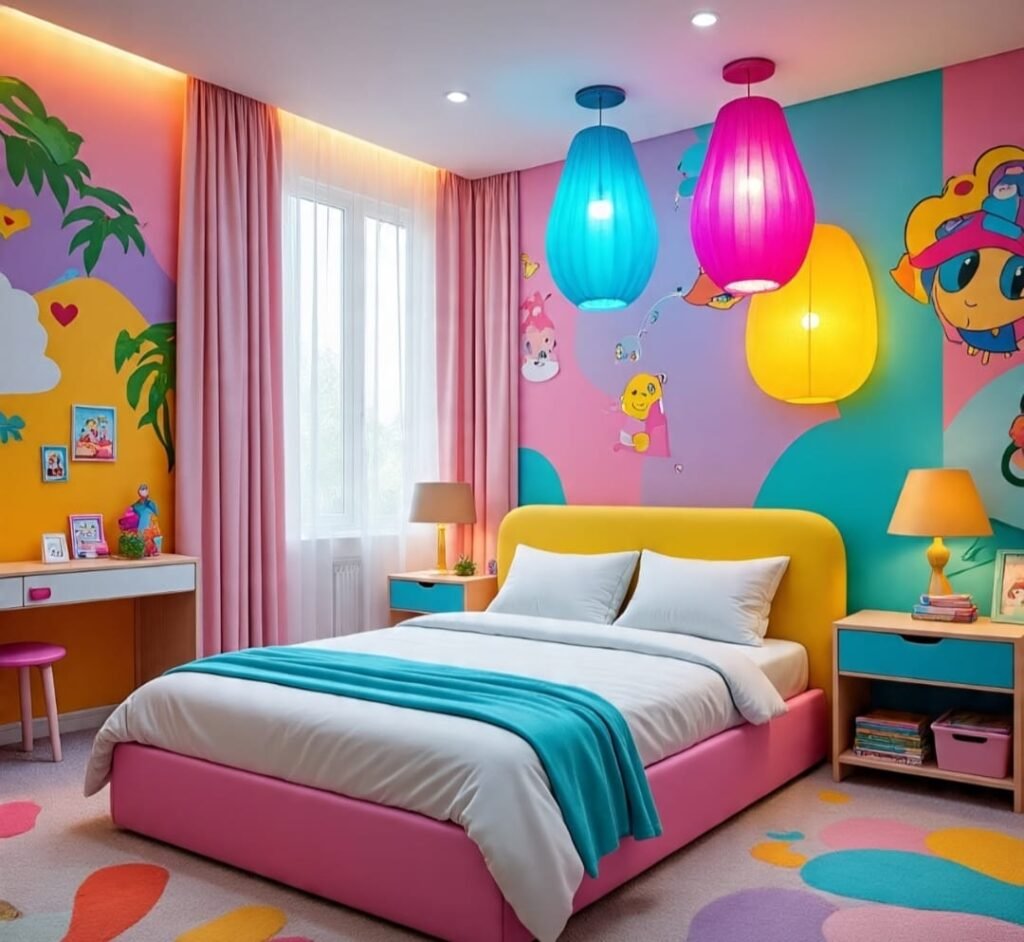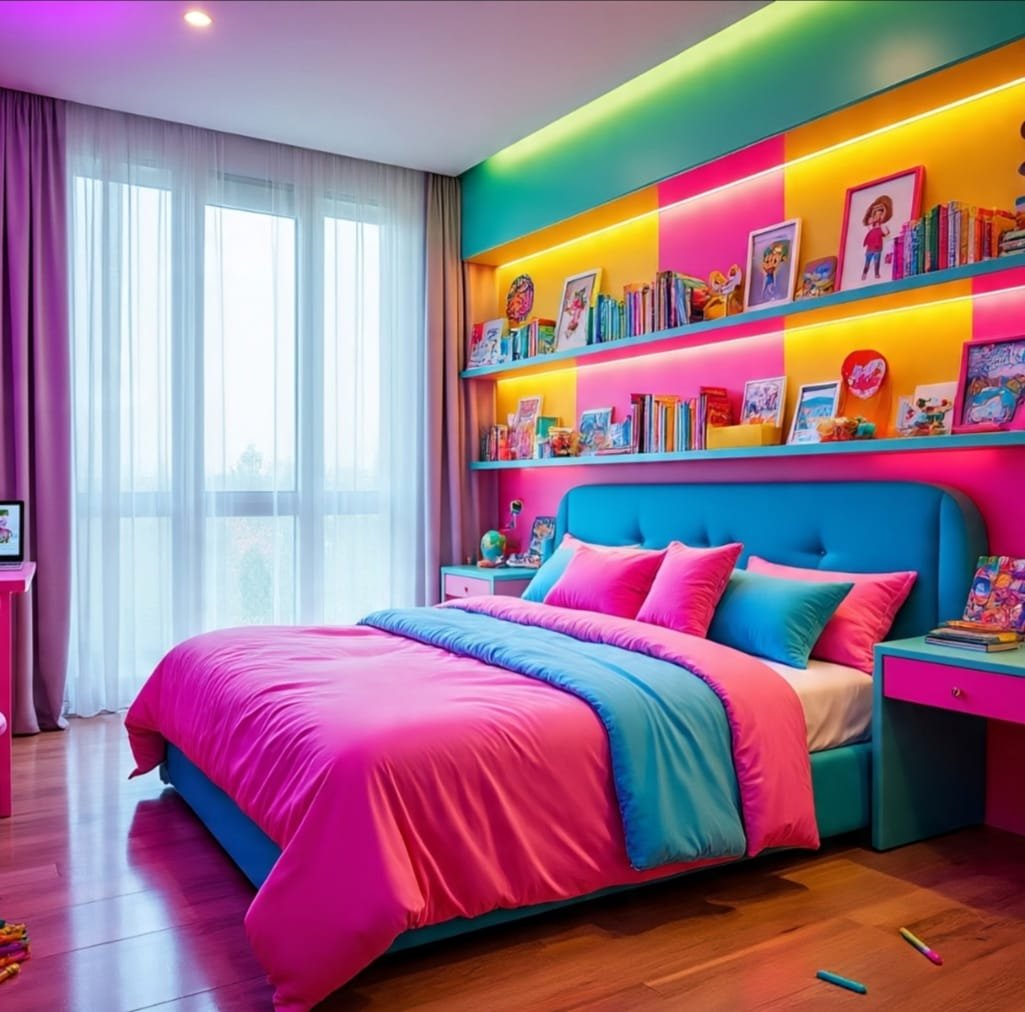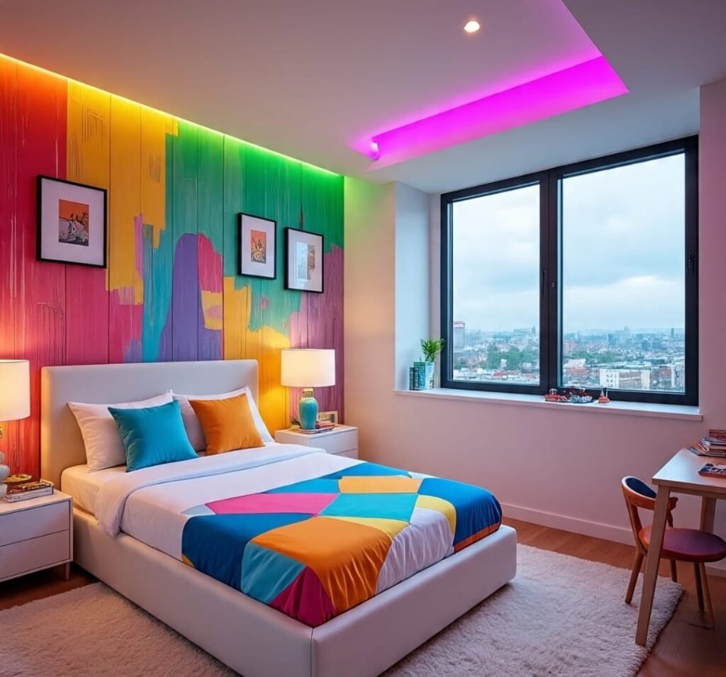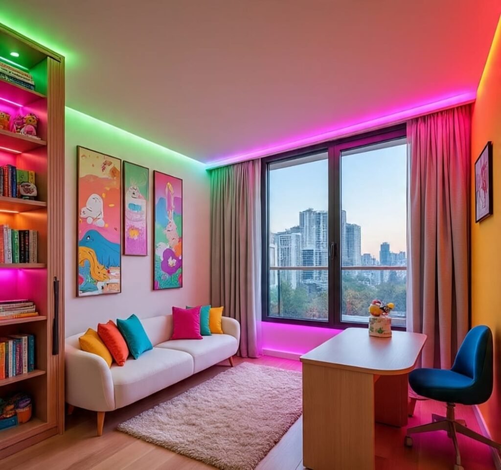 The third room opens itself with bold, vivid strokes like painted clouds gathering around a sunset. Neon greens and pinks sweep along the ceiling edges, guiding the eye toward the tall window overlooking a distant city. This blend of interior light and urban horizon creates a bridge between the stillness of a room and the movement of the world outside. The small seating area along the wall carries bright cushions arranged with the same care as beads on traditional craftwork—colorful, intentional, and full of life. A small wooden desk stands nearby, humble yet ready to hold ideas, drawings, or moments of study. Artwork on the walls bursts with layered shades, mirroring the glowing ceiling above. The floor rug softens the footsteps of anyone who enters, adding a layer of comfort to the room’s energetic design. The room feels youthful, expressive, and brave, like someone learning to walk their own bright path. The colors rise, fall, and blend, forming a space where creativity breathes freely and rest settles gently.
