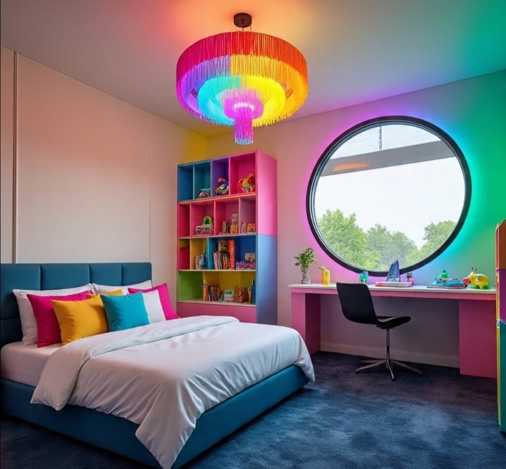 In this lively room, the circular neon fixture shines overhead like a glowing sun at its peak. The ceiling colors shift between greens and purples, bringing contrast and movement. The bedding carries a mosaic of shapes and colors, reflecting creativity and youthful energy. Wide windows bring in daylight, balancing the electric glow inside. It’s a space full of playful expression and vibrant ideas.