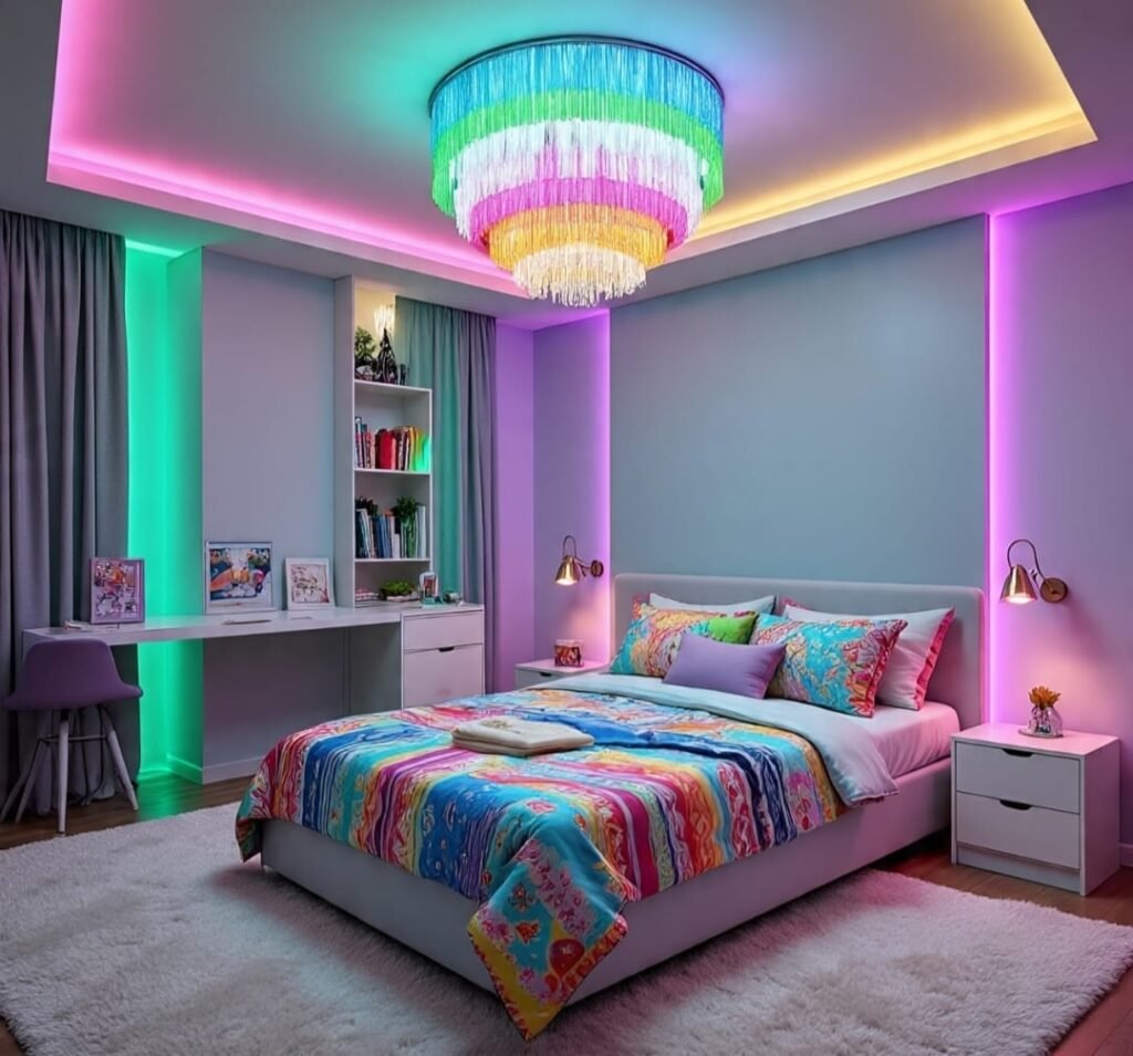 In the second room, the bright chandelier crowns the ceiling like a gathering of spirits dancing in a circle, each strand glowing in its own voice. The ceiling radiates a halo of neon greens and warm magentas, casting soft reflections across the sky-blue walls. Beneath this colorful canopy rests a bed dressed in woven layers of sunset reds, turquoise blues, and golden streaks—tones that speak of both land and horizon. The desk and shelves sit close, filled with books, trinkets, and youthful treasures. Everything is placed with intention: nothing too crowded, nothing too bare. The space feels like a young person’s lodge—where ideas form, dreams gather, and creativity springs to life like water from a mountain stream. The colors don’t overwhelm; rather, they guide your eyes like a path through an evening prairie, shifting from warm to cool, from bright to soft. The rug beneath the bed seems to ground the entire room, anchoring all that vibrant energy. Here, rest and inspiration share the same breath. Anyone stepping into this space would feel its balance—between modern creativity and the quiet, steady heart of tradition. The soft furnishings call for comfort, while the lights call for imagination. Together, they shape a room that feels both grounded and lifted, rooted yet reaching.