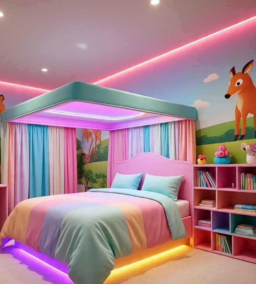 The sixth room features a glowing canopy bed that feels like stepping into a dream lodge—a soft, sacred space of color and quiet imagination. Shades of pink, lavender, and warm amber wrap the room with gentle energy. Shelves nearby cradle books and small treasures. The deer-themed mural at the back adds a natural touch, as if the forest spirit watches over the resting space. The glowing lights under the bed create a sense of floating, making the whole place feel enchanted, warm, and protective.
