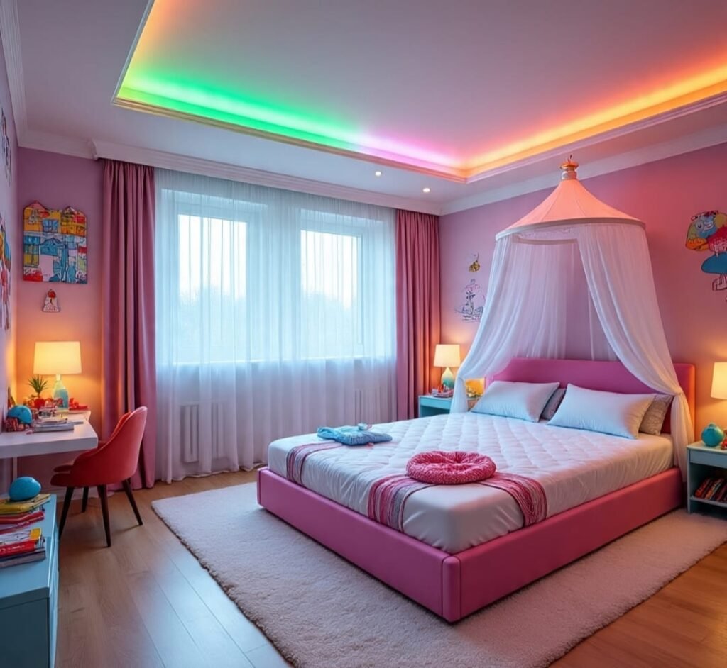 This room feels like evening comfort. A soft canopy drapes over the bed like a protective circle, while warm pink and orange highlights glow along the ceiling edges. Nightstands with lamps create warm patches of amber light, offering a peaceful place to unwind. The room blends youthful charm with gentle warmth, building a sanctuary where rest is honored and cherished.