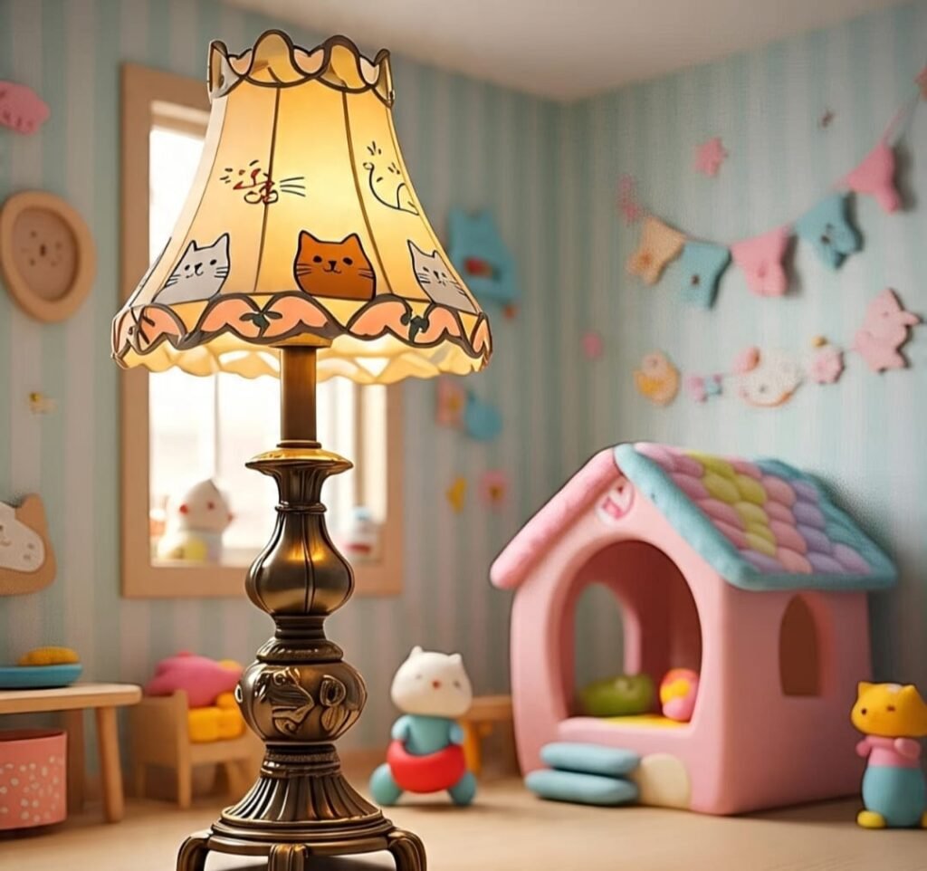 This children’s lamp, decorated with soft colors and a playful theme, lights bedrooms with warmth and innocence. SEO terms: kids room lamp decor, nursery table lamp, playful home lighting. It is a guardian of nighttime comfort and gentle dreams.