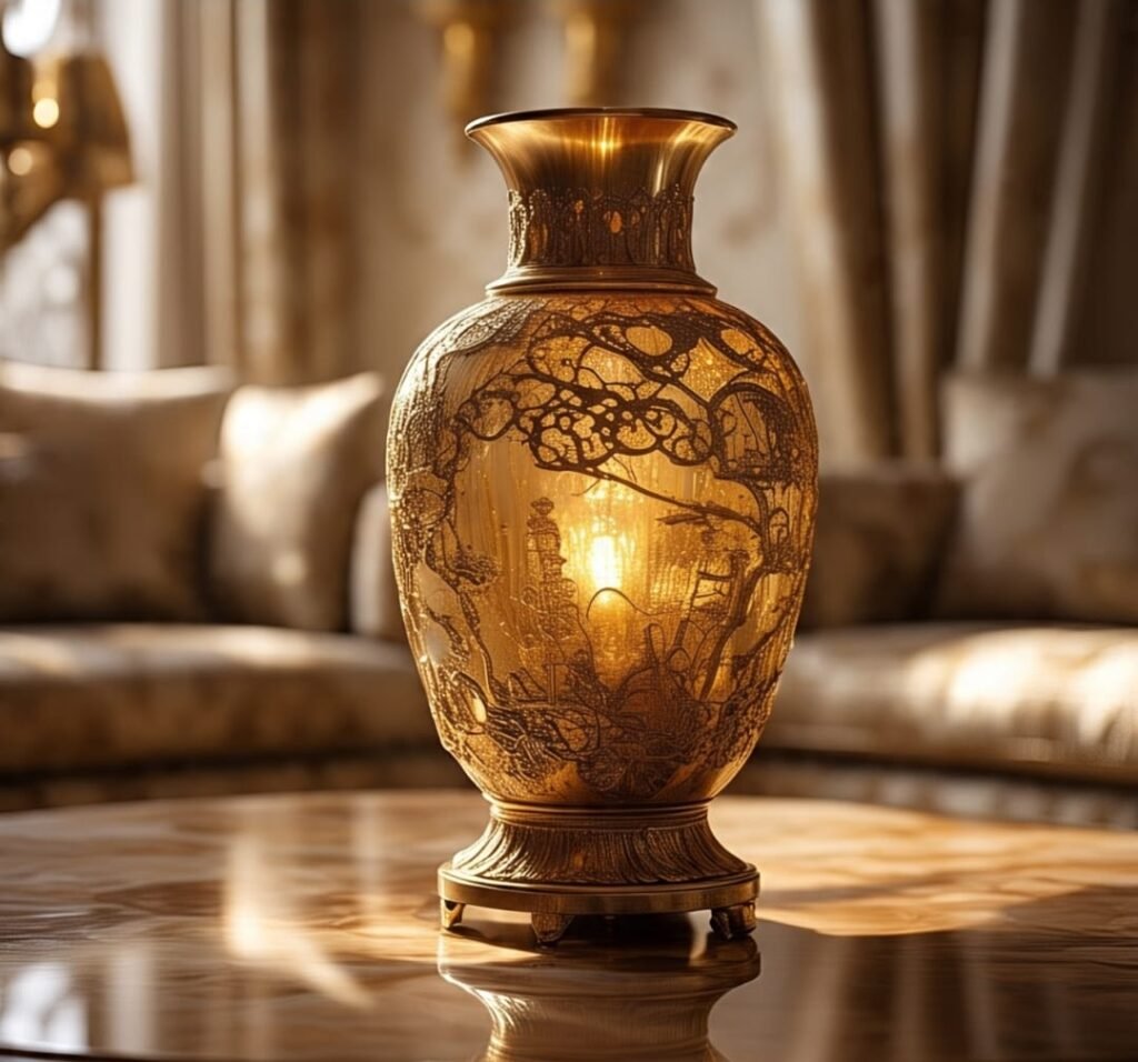 This amber-gold vase shines like carved sunlight, giving older rooms a lifted, regal feel. SEO terms: golden vase decor, amber glass accent, classic decorative jar. Its glow looks ancient yet timeless, like a vessel meant to hold treasured memories.
