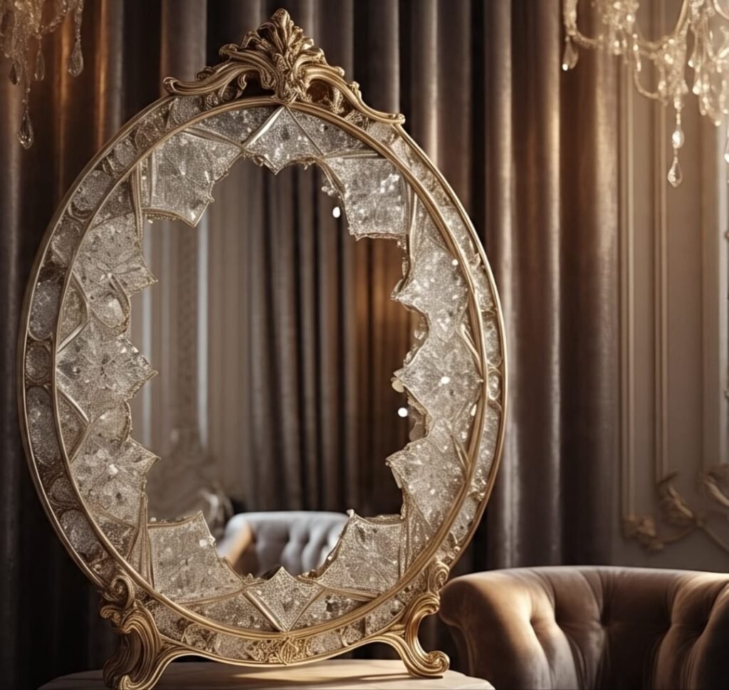 This circular mirror framed with intricate golden leaves creates a sense of continuity and connection. SEO terms: round golden mirror decor, leaf frame mirror, luxury wall accent. It reflects light and memory, deepening the room’s atmosphere.