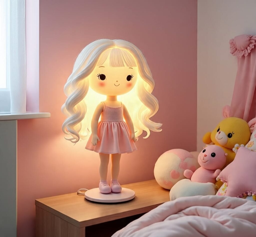 This soft pink lamp shaped like a doll brings innocence and comfort to children’s spaces. SEO terms: kids doll lamp, soft glow nursery decor. It protects the room with warmth and sweetness.