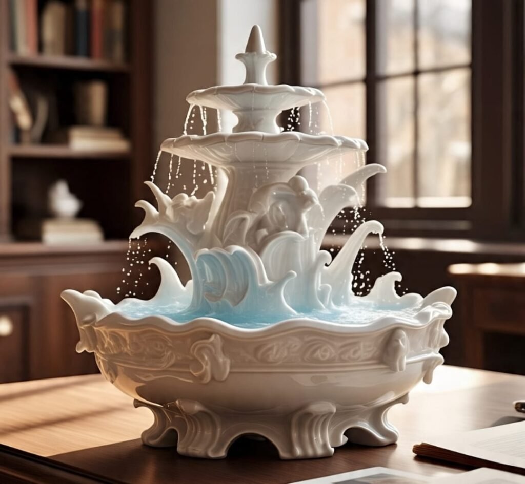 This decorative fountain shaped with ocean waves creates a calming, water-inspired presence. SEO terms: indoor fountain decor, ocean wave sculpture, relaxing home accent. It invites serenity and balance, filling the space with quiet energy.
