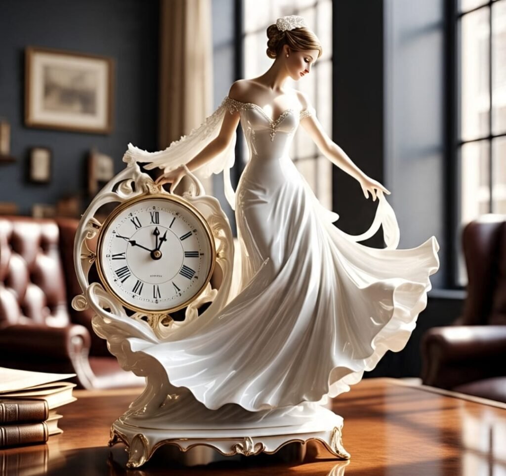 This sculpture of a graceful woman holding a clock blends movement, femininity, and elegance. Her flowing dress and poised stance bring refined charm to entryways or classic-style living rooms. SEO terms: lady clock sculpture, elegant home decor, dancer timepiece. She stands as a reminder that time should be moved with, not battled against.