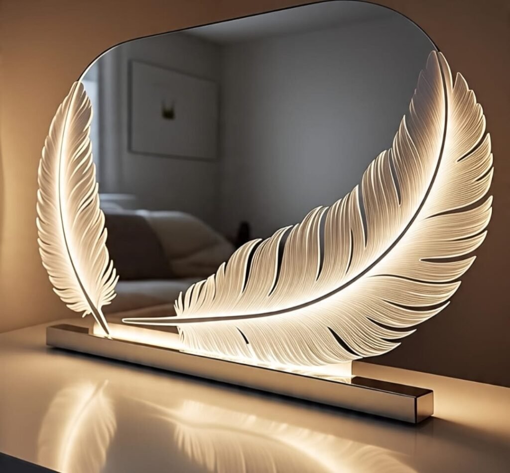 Feathers represent renewal, guidance, and messages from beyond. This golden feather decor piece curves gently, creating a reflective surface that lights up modern or metallic-themed rooms. SEO terms: gold feather decor, symbolic centerpiece, modern metallic sculpture. It encourages calm steps and mindful decisions.