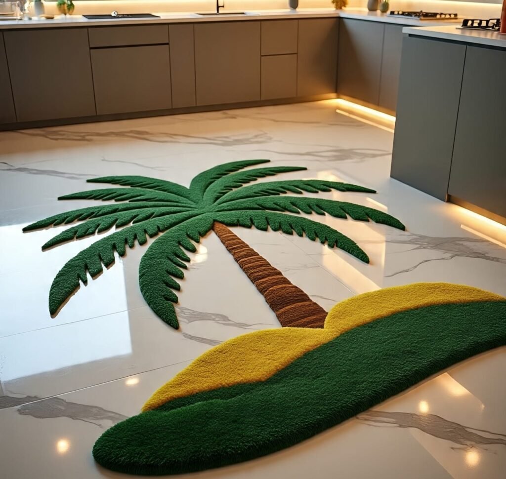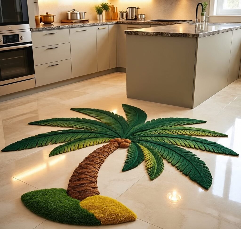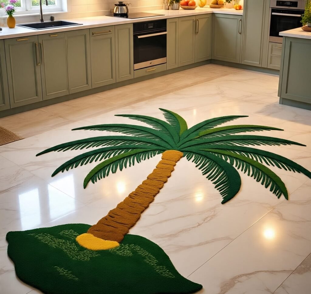 This kitchen carpet blooms like a proud palm tree on a soft green island, where the golden sand is woven in the base. The trunk grows to a rich brown texture, gently curved like a warm air flows, while wide green platforms spread over your floor, giving life to every corner. When the morning light is streamlined through your window, the colors are bright, filling your kitchen with tropical spirit and peaceful energy. This soft under the feet, stable, but welcome, moves every step towards the stove or looks like a walk on a sunshine. An ideal choice for those who want to weave the silence of nature in daily life.