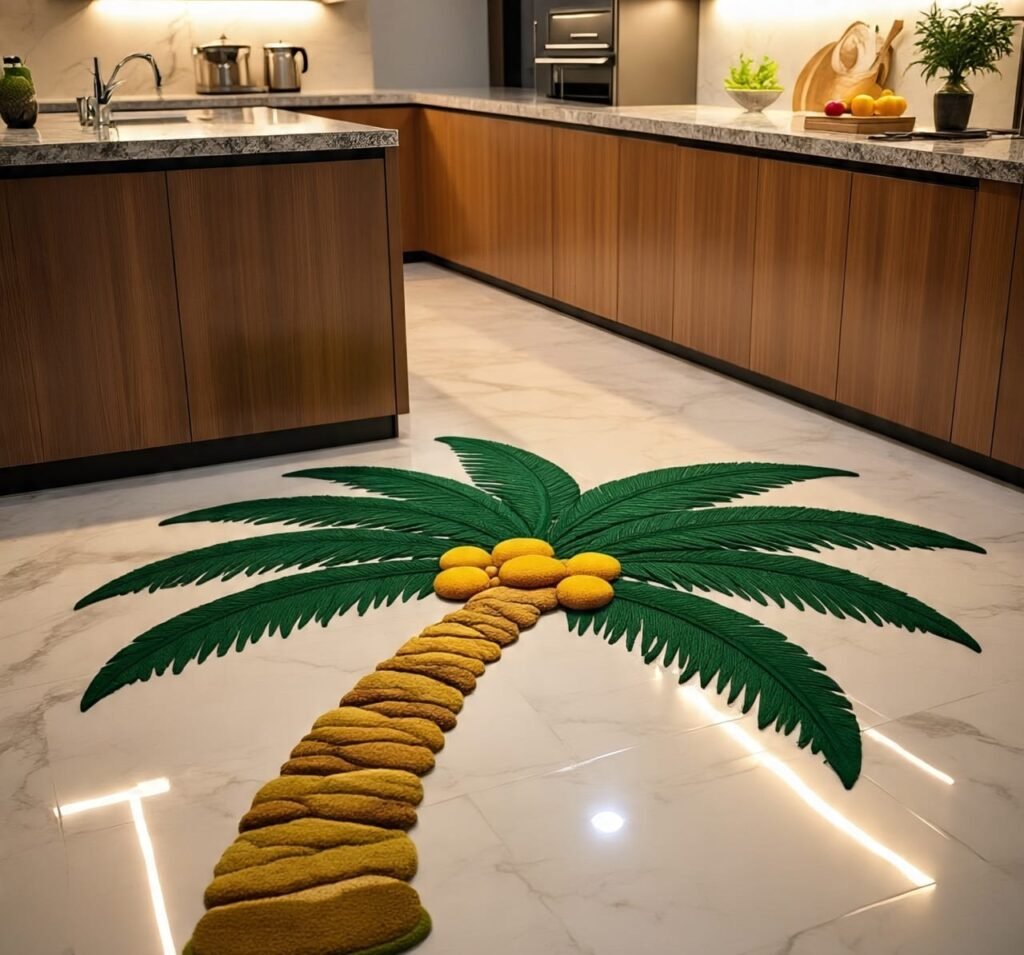 In the middle of your kitchen, a palm wood and shaped blanket gives a feeling of distant beaches and cool winds. The trunk grows into a soft brown texture, while the wide green leaves spread like open hands, provide cool and freshness. This design is perfect for light kitchens, creating a vibrant place where cooking looks like summer morning at sea. Soft fiber reminds you that you slow down every step and enjoy. Place it near the island or cooking area and let its natural shape guide the energy in the room. With each look you feel the soft rhythm of soil, sand and life.
