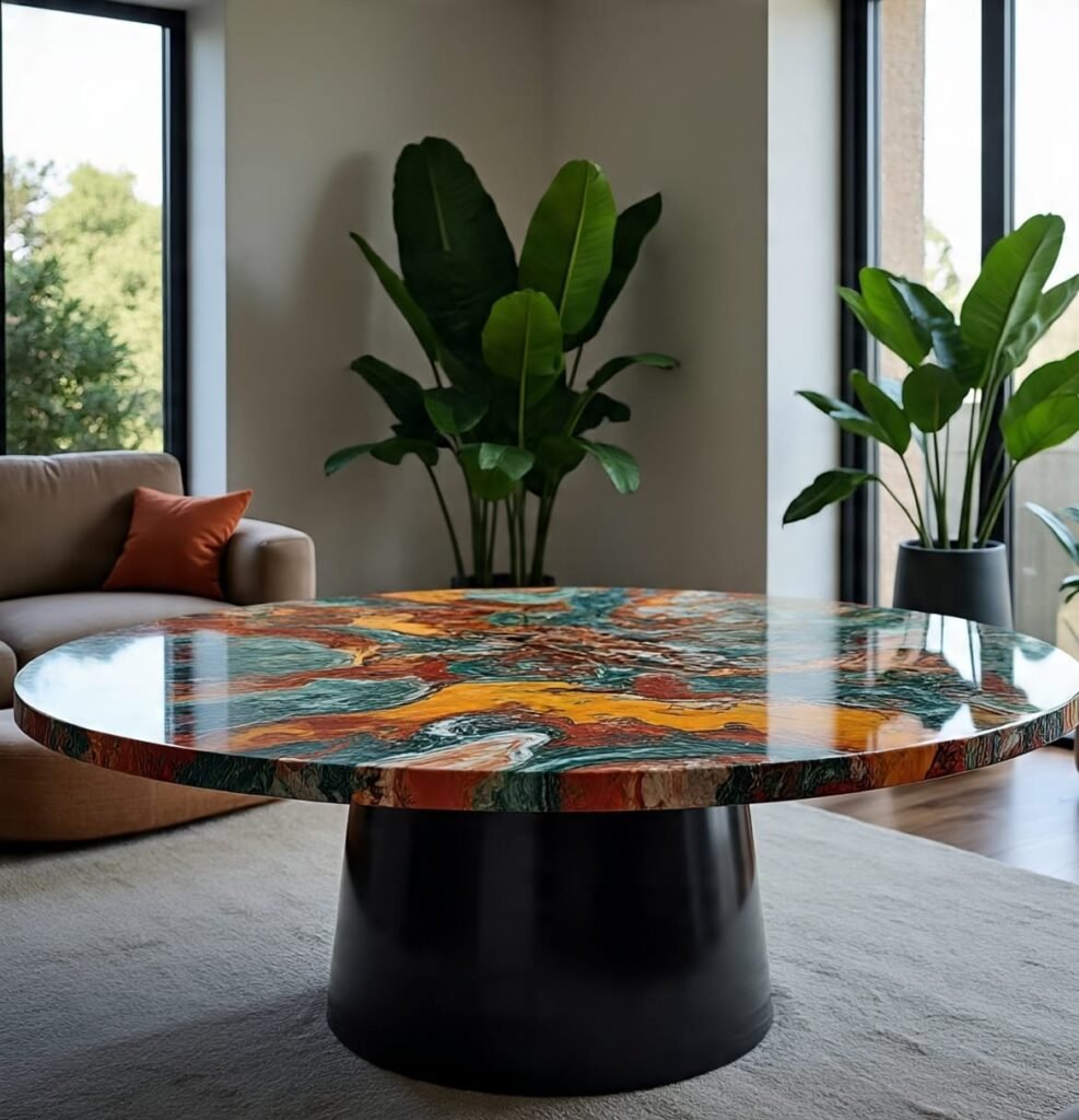 Swirls of turquoise, coral, and deep blue meet on this stunning round table, evoking waves frozen mid-motion. The green plants beside it breathe life into the scene, echoing the ocean’s renewal. A black base grounds the composition, balancing movement with stability. Light filters through soft curtains, shimmering across the marble’s surface like sunlight on water. Every detail honors balance — between color and calm, fluidity and form. This table is more than décor — it’s the ocean’s heart, resting gently in your home.