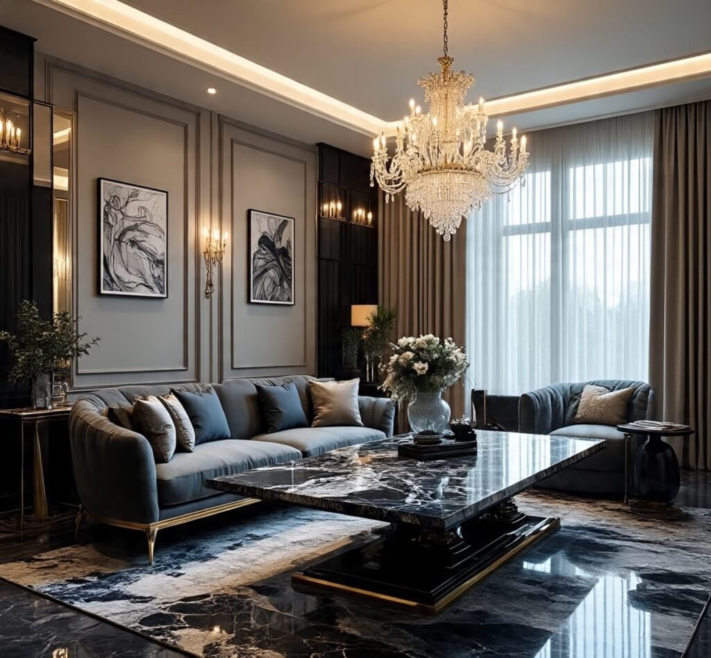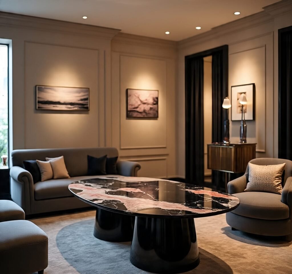 In this elegant space, chandeliers shimmer over a sleek marble surface that glows in subtle gray and blue hues. Dark furnishings embrace the table, amplifying its quiet luster. This room feels like a secret retreat, a sanctuary of evening reflections. The table’s reflective surface doubles the light, creating a dance of gold and silver across the air. “Luxury marble table decor” finds its highest form here — one that honors refinement without excess, power without pride. It’s a vision of grace shaped by patience and light.