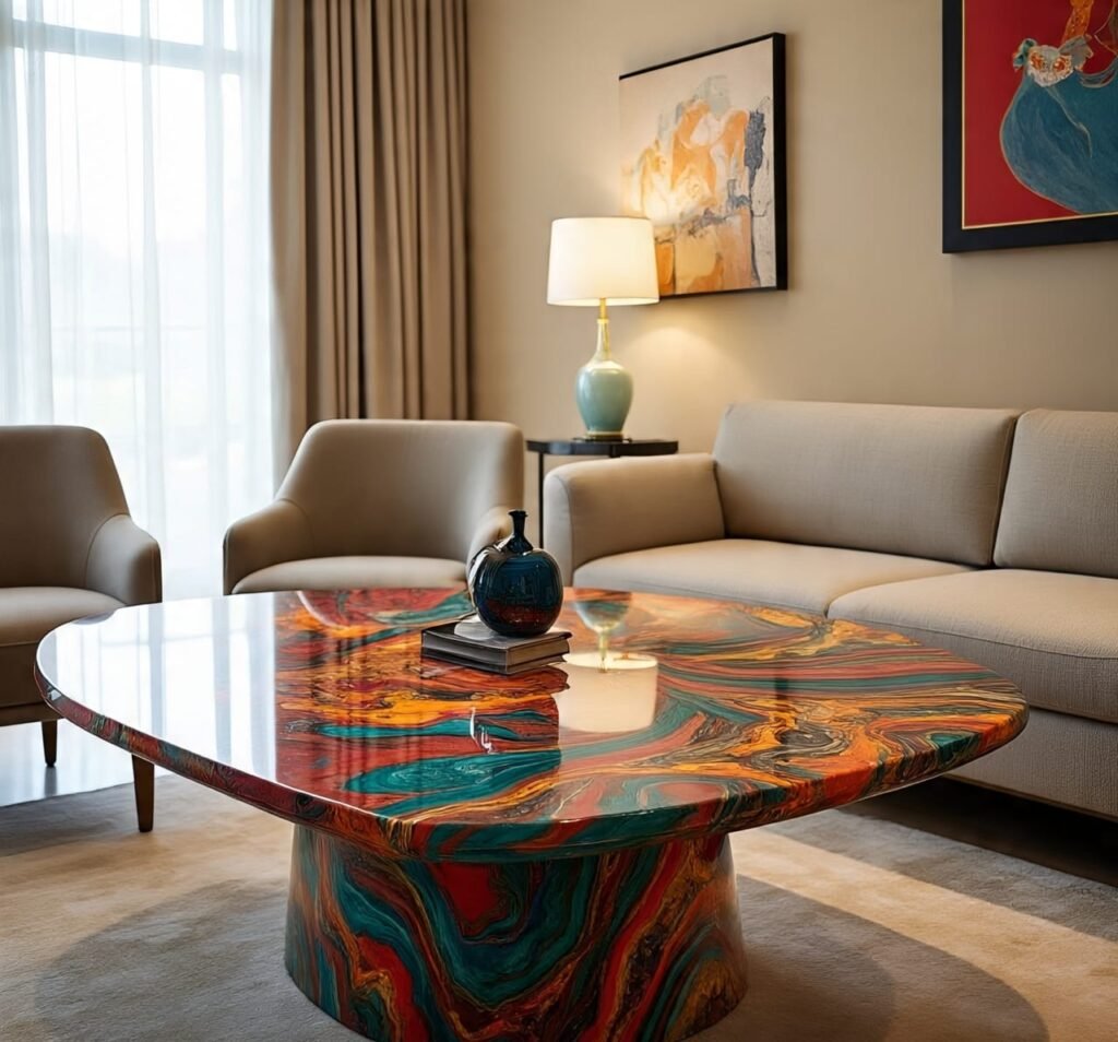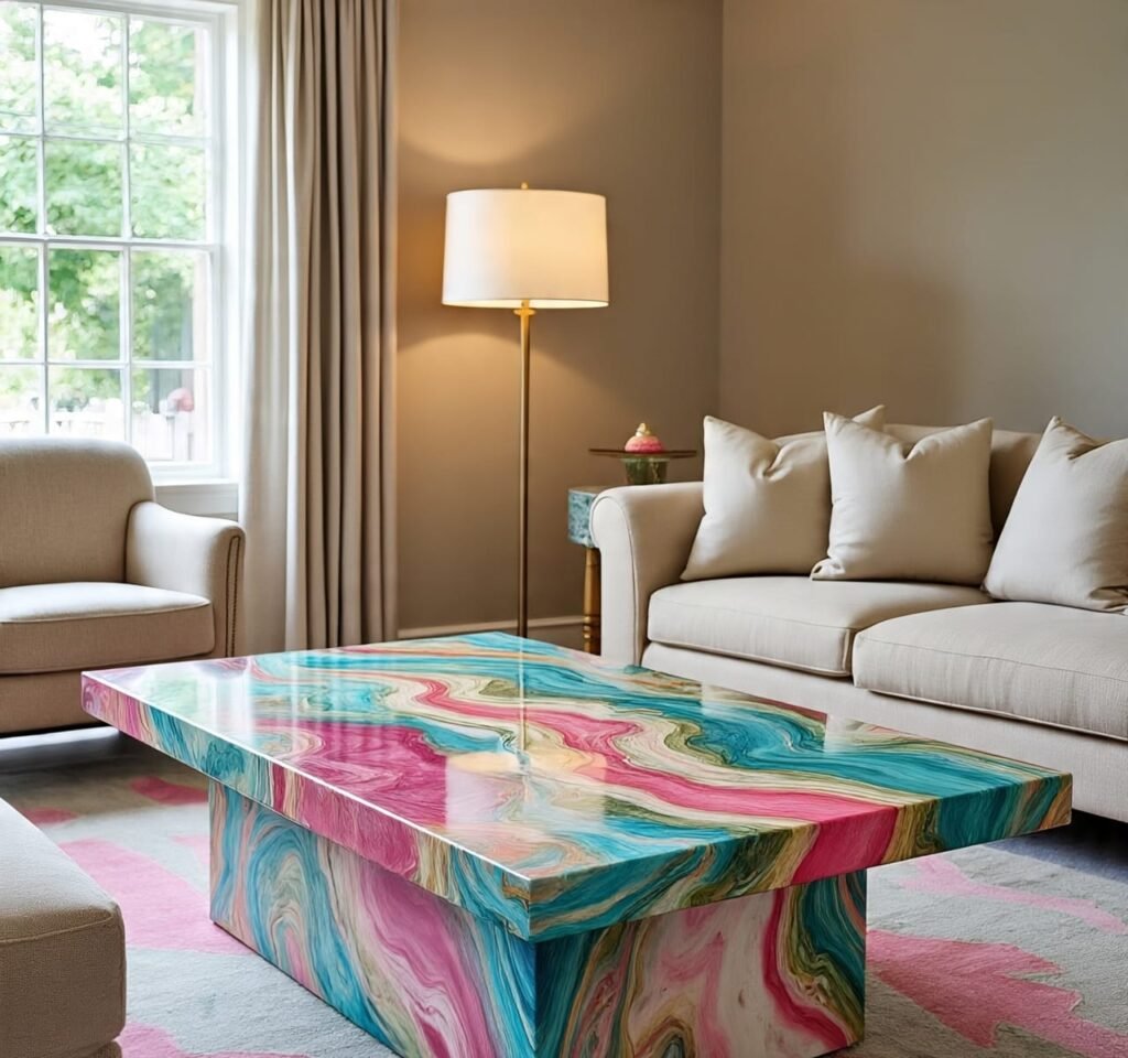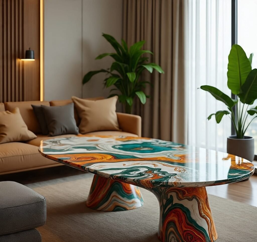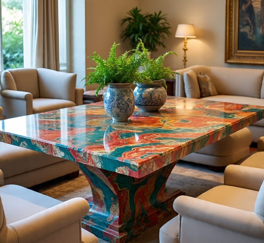 This table ripples with color — shades of pink, turquoise, and coral weaving through its marble veins like river currents frozen in time. The soft beige sofa and glowing lamp form a gentle frame around it, letting the table’s artistry lead the eye. It’s more than furniture; it’s a story of flow and movement. Every curve tells of nature’s craftsmanship, every hue speaks of balance. The room feels open, airy, touched by morning light — a place where color awakens the soul, and “Luxury marble table decor” becomes poetry in stone.