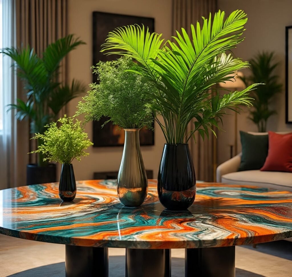 Here, multiple marble tables unite beneath lush plants, forming a lush sanctuary of growth and reflection. The colors of emerald, orange, and cream swirl in organic patterns, echoing the forest’s song. It’s a space that feels both luxurious and alive — where life and stone breathe together. The arrangement invites sharing, laughter, and connection. True “Luxury marble table decor” lies in this unity — the merging of art, nature, and human warmth under one peaceful canopy.