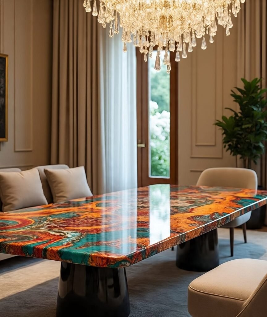A table alive with copper, teal, and gold patterns anchors this welcoming room. Surrounded by warm beige furniture and sunlight, it becomes a living sculpture of mineral art. The energy of the design feels tribal — ancient yet vibrant. Every glance reveals a new detail in the marble’s intricate veins, a reminder of time’s deep artistry. This piece doesn’t just decorate; it tells a story that connects every guest to the heartbeat of nature itself.