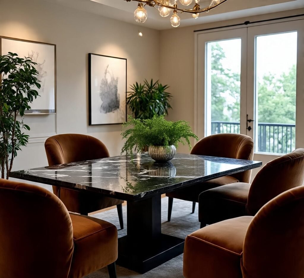 Warmth radiates from this space — golden light brushing over rich brown chairs and a table glowing in honey-colored marble. The setting feels like autumn sunlight pouring through trees. Each surface catches light differently, forming layers of depth and serenity. A perfect corner for evening tea, where conversation lingers and time slows. The marble’s pattern feels alive, its movement subtle but endless. Here, “Luxury marble table decor” doesn’t shout wealth — it breathes comfort, connection, and a deep reverence for life’s quiet moments.